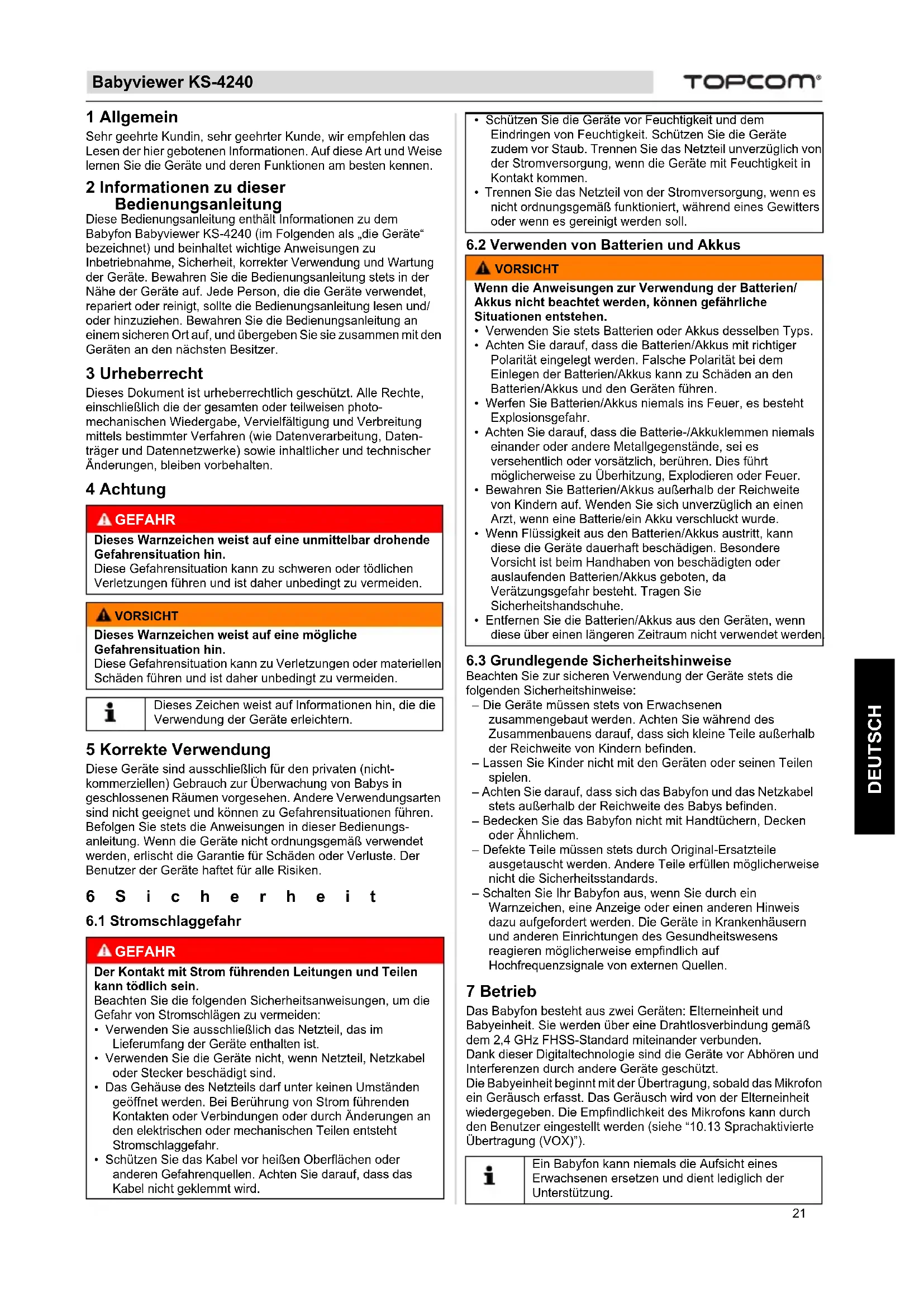 DEUTSCH 1 Allgemein Sehr geehrte Kundin, sehr geehrter Kunde, wir empfehlen das Lesen der hier gebotenen Informationen. Auf diese Art und Weise lernen Sie die Geräte und deren Funktionen am besten kennen. 2 Informationen zu dieser Bedienungsanleitung Diese Bedienungsanleitung enthält Informationen zu dem Babyfon Babyviewer KS-4240 (im Folgenden als „die Geräte“ bezeichnet) und beinhaltet wichtige Anweisungen zu Inbetriebnahme, Sicherheit, korrekter Verwendung und Wartung der Geräte. Bewahren Sie die Bedienungsanleitung stets in der Nähe der Geräte auf. Jede Person, die die Geräte verwendet, repariert oder reinigt, sollte die Bedienungsanleitung lesen und/ oder hinzuziehen. Bewahren Sie die Bedienungsanleitung an einem sicheren Ort auf, und übergeben Sie sie zusammen mit den Geräten an den nächsten Besitzer. 3 Urheberrecht Dieses Dokument ist urheberrechtlich geschützt. Alle Rechte, einschließlich die der gesamten oder teilweisen photo- mechanischen Wiedergabe, Vervielfältigung und Verbreitung mittels bestimmter Verfahren (wie Datenverarbeitung, Daten- träger und Datennetzwerke) sowie inhaltlicher und technischer Änderungen, bleiben vorbehalten. 4 Achtung 5 Korrekte Verwendung Diese Geräte sind ausschließlich für den privaten (nicht- kommerziellen) Gebrauch zur Überwachung von Babys in geschlossenen Räumen vorgesehen. Andere Verwendungsarten sind nicht geeignet und können zu Gefahrensituationen führen. Befolgen Sie stets die Anweisungen in dieser Bedienungs- anleitung. Wenn die Geräte nicht ordnungsgemäß verwendet werden, erlischt die Garantie für Schäden oder Verluste. Der Benutzer der Geräte haftet für alle Risiken. 6Sicherheit