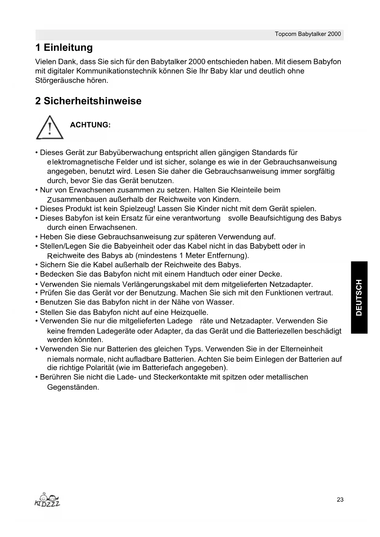 - Dieses Babyfon ist kein Ersatz für eine verantwortung svolle Beaufsichtigung des Babys durch einen Erwachsenen.