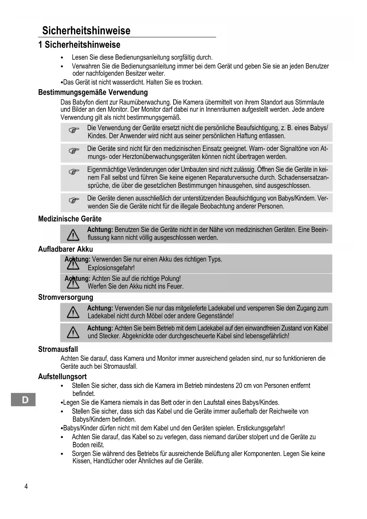 | Die Verwendung der Geräte ersetzt nicht die persönliche Beaufsichtigung, z. B. eines Babys/ Kindes. Der Anwender wird nicht aus seiner persönlichen Haftung entlassen. |
