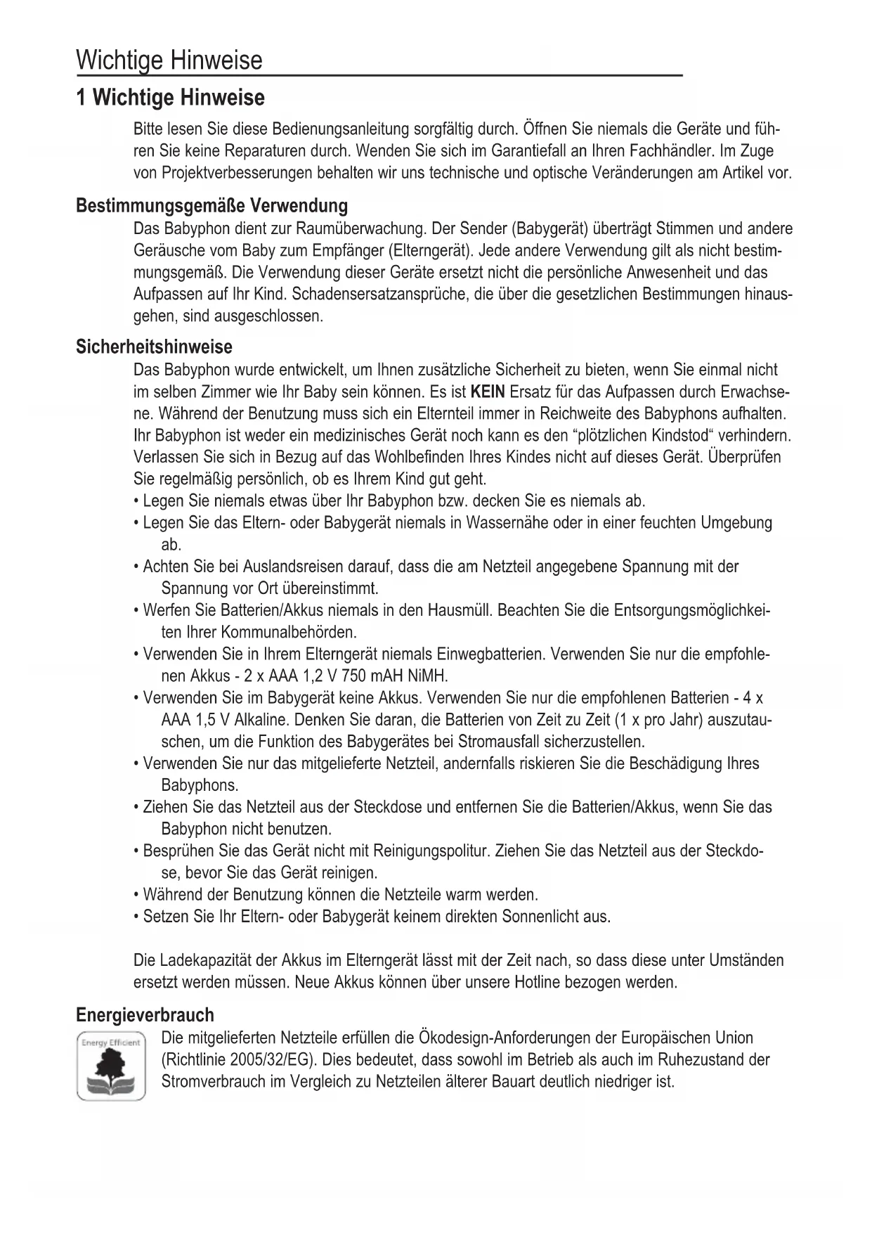 Das Babyphon wurde entwickelt, um Ihnen zusätzliche Sicherheit zu bieten, wenn Sie einmal nicht im selben Zimmer wie Ihr Baby sein können. Es ist KEIN Ersatz für das Aufpassen durch Erwachse- ne. Während der Benutzung muss sich ein Elternteil immer in Reichweite des Babyphons aufhalten. Ihr Babyphon ist weder ein medizinisches Gerät noch kann es den "plötzlichen Kindstod" verhindern. Verlassen Sie sich in Bezug auf das Wohlbefinden Ihres Kindes nicht auf dieses Gerät. Überprüfen Sie regelmäßig persönlich, ob es Ihrem Kind gut geht.