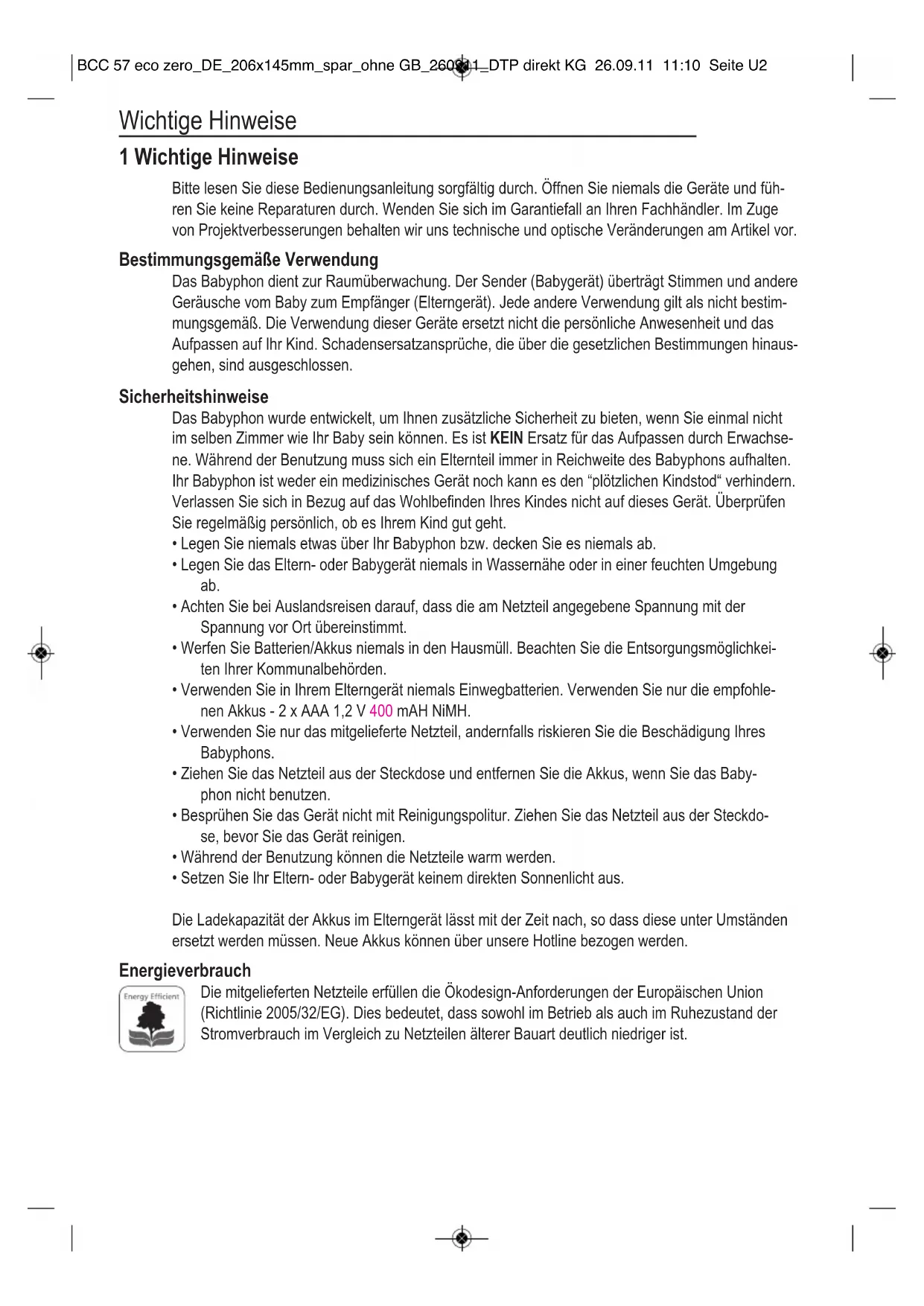 - Verwenden Sie in Ihrlem Elterngerät niemals Einwegbatterien. Verwenden Sie nur die empfohlenen Akkus - 2 x AAA 1,2 V 400 mAH NiMH.