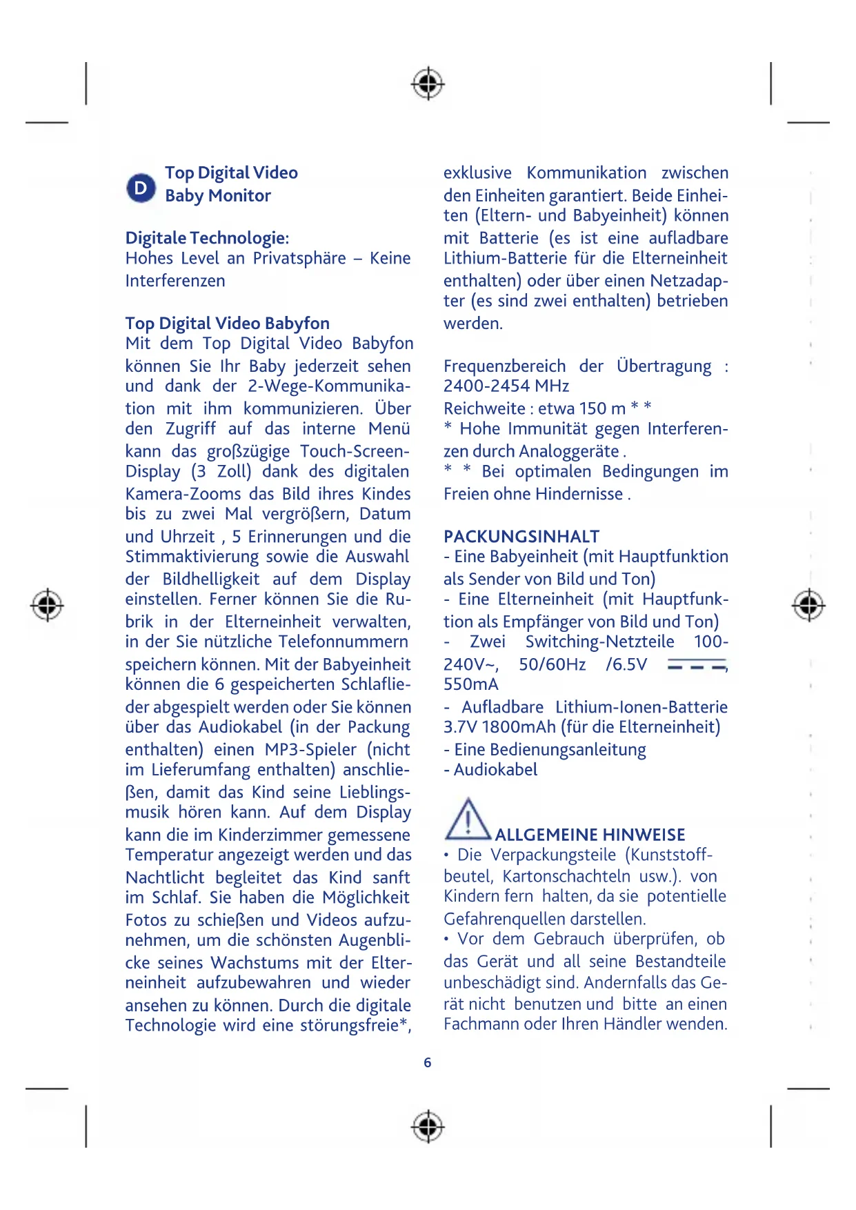 - Es ist sehr wichtig, dass Sie vor jedem Gebrauch die Funktionstüchtigkeit der Babyeinheit (mit Hauptfunktion6