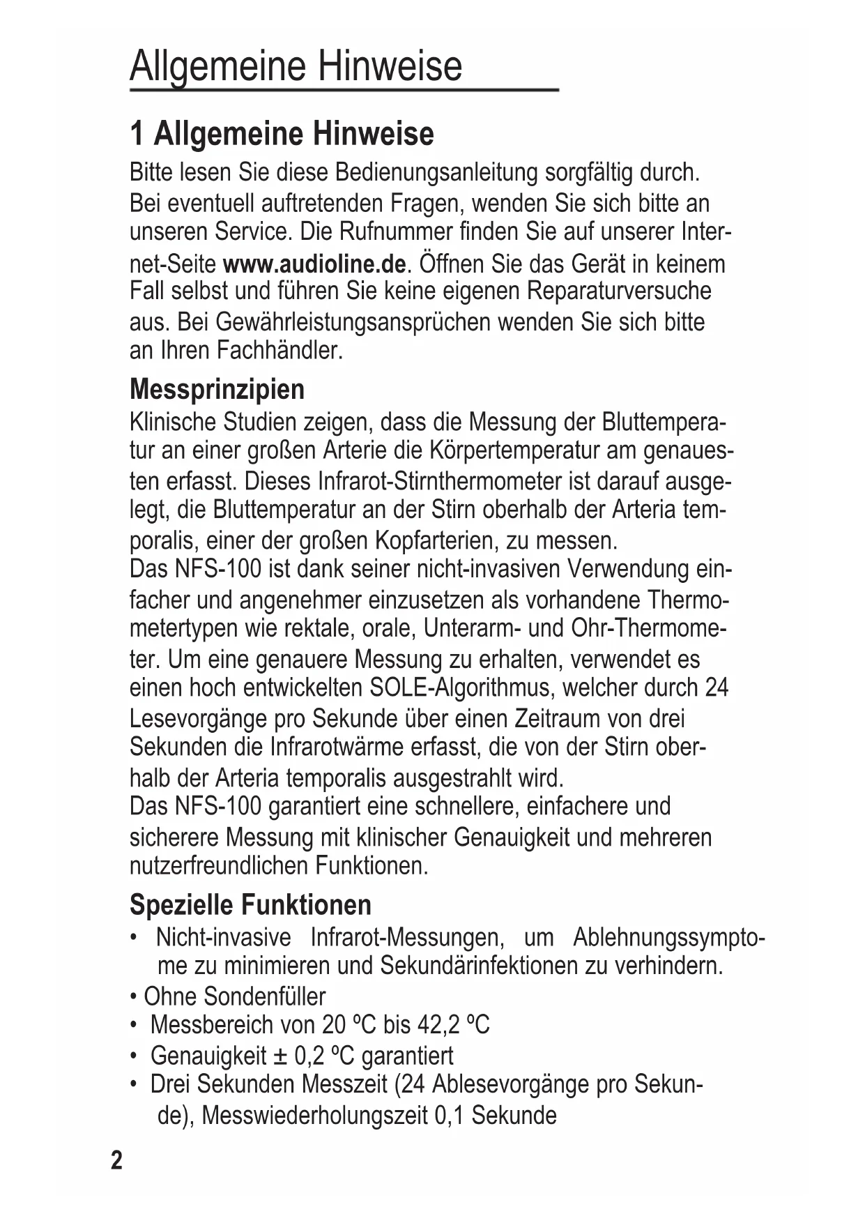 1 Allgemeine Hinweise Bitte lesen Sie diese Bedienungsanleitung sorgfältig durch. Bei eventuell auftretenden Fragen, wenden Sie sich bitte an unseren Service. Die Rufnummer finden Sie auf unserer Inter- net-Seite www.audioline.de. Öffnen Sie das Gerät in keinem Fall selbst und führen Sie keine eigenen Reparaturversuche aus. Bei Gewährleistungsansprüchen wenden Sie sich bitte an Ihren Fachhändler. Messprinzipien Klinische Studien zeigen, dass die Messung der Bluttempera- tur an einer großen Arterie die Körpertemperatur am genaues- ten erfasst. Dieses Infrarot-Stirnthermometer ist darauf ausge- legt, die Bluttemperatur an der Stirn oberhalb der Arteria tem- poralis, einer der großen Kopfarterien, zu messen. Das NFS-100 ist dank seiner nicht-invasiven Verwendung ein- facher und angenehmer einzusetzen als vorhandene Thermo- metertypen wie rektale, orale, Unterarm- und Ohr-Thermome- ter. Um eine genauere Messung zu erhalten, verwendet es einen hoch entwickelten SOLE-Algorithmus, welcher durch 24 Lesevorgänge pro Sekunde über einen Zeitraum von drei Sekunden die Infrarotwärme erfasst, die von der Stirn ober- halb der Arteria temporalis ausgestrahlt wird. Das NFS-100 garantiert eine schnellere, einfachere und sicherere Messung mit klinischer Genauigkeit und mehreren nutzerfreundlichen Funktionen. Spezielle Funktionen