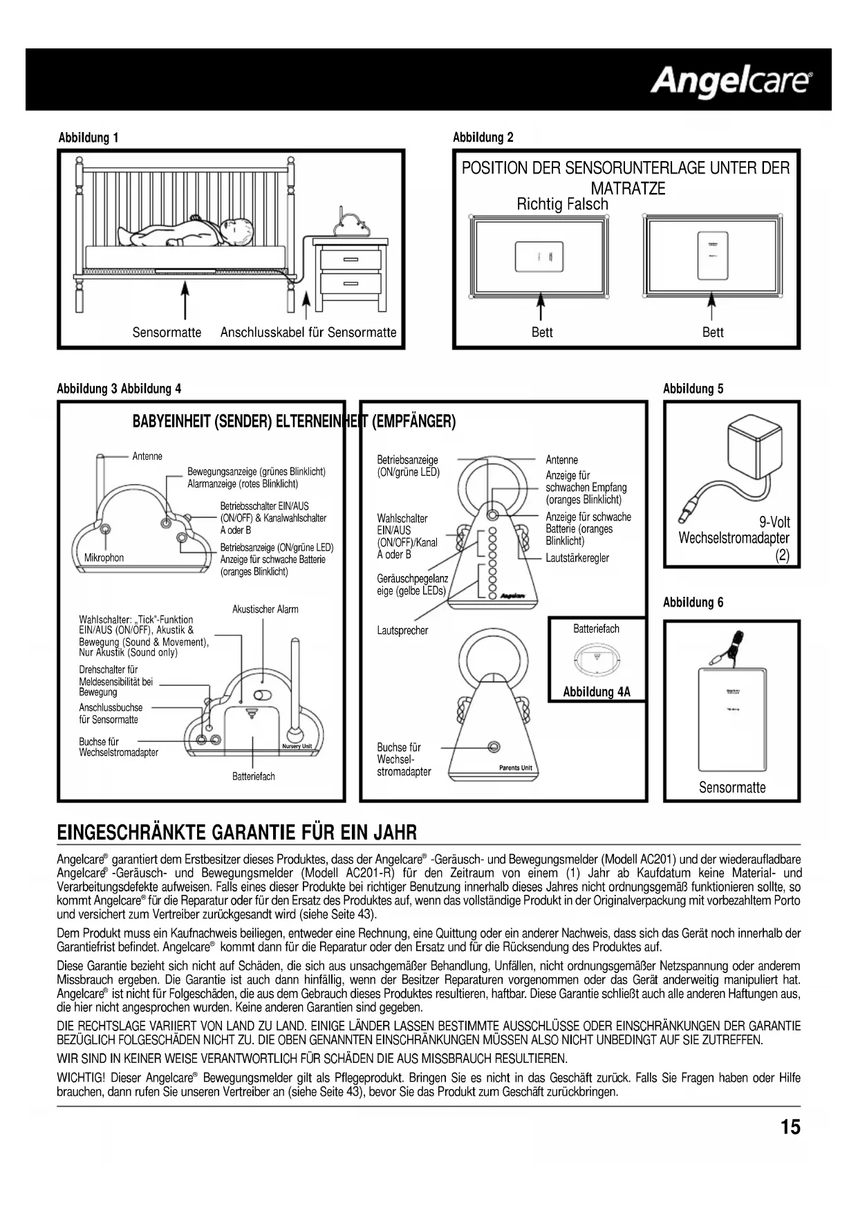 Parents UnitNursery Unit Buchse fürWechsel-stromadapterDrehschalter fürMeldesensibilität beiBewegungBatteriefachBatteriefach 9-Volt Wechselstromadapter (2) AntenneBewegungsanzeige (grünes Blinklicht)Alarmanzeige (rotes Blinklicht)MikrophonLautstärkereglerAnzeige für schwacheBatterie (orangesBlinklicht)Betriebsschalter EIN/AUS(ON/OFF) & KanalwahlschalterA oder BBetriebsanzeige (ON/grüne LED)Anzeige für schwache Batterie(oranges Blinklicht)Betriebsanzeige(ON/grüne LED)WahlschalterEIN/AUS(ON/OFF)/Kanal A oder BGeräuschpegelanzeige (gelbe LEDs)Lautsprecher Sensormatte Abbildung 6 Akustischer AlarmWahlschalter: „Tick"-FunktionEIN/AUS (ON/OFF), Akustik &Bewegung (Sound & Movement),Nur Akustik (Sound only)Buchse fürWechselstromadapterAnschlussbuchse für SensormatteAnzeige fürschwachen Empfang(oranges Blinklicht) Anschlusskabel für Sensormatte Bett Bett Sensormatte Abbildung 3 Abbildung 4 Abbildung 4A Abbildung 5 BABYEINHEIT (SENDER) ELTERNEINHEIT (EMPFÄNGER) Antenne