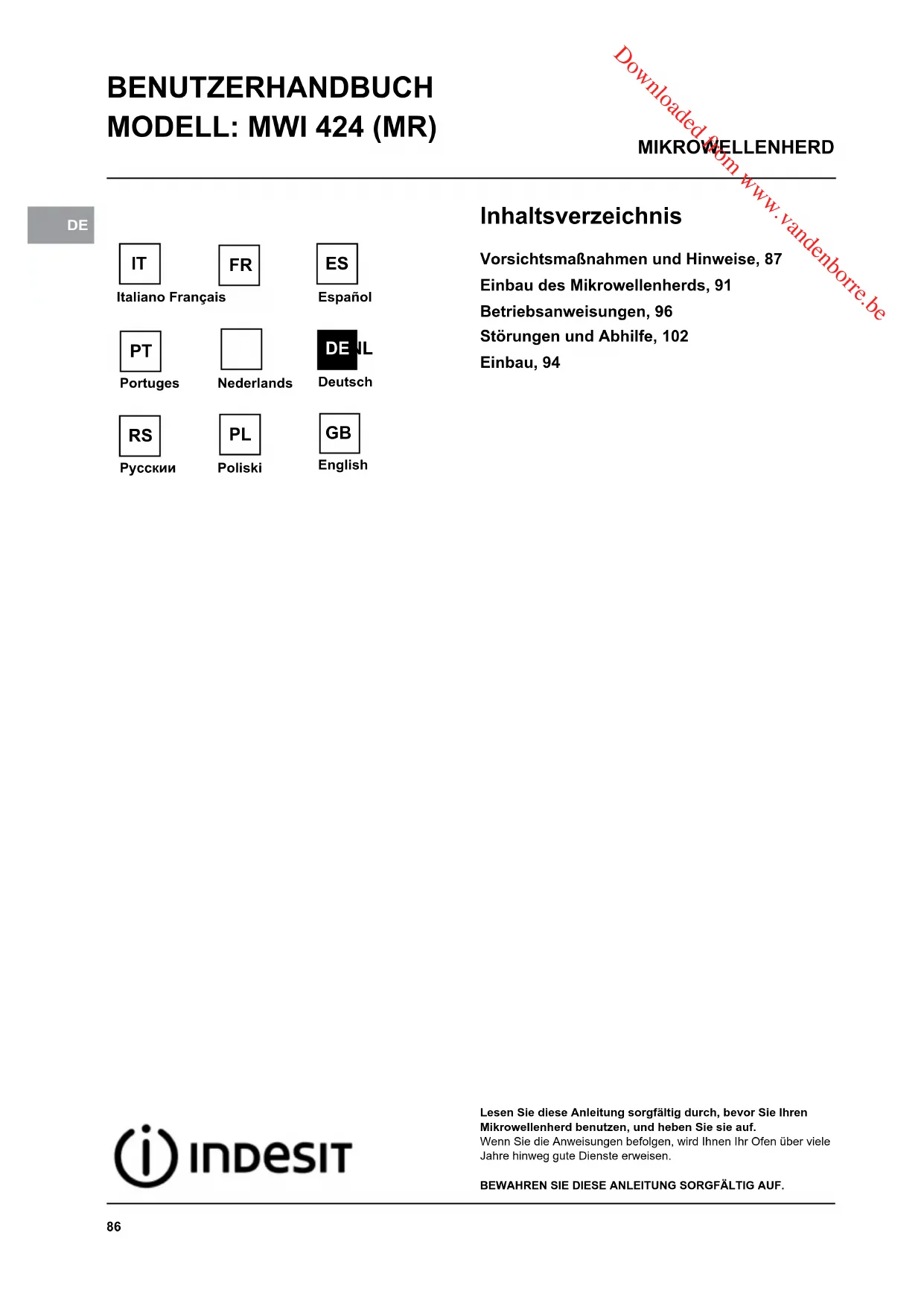 BENUTZERHANDBUCH MODELL: MWI 424 (MR) MIKROWELLENHERD Lesen Sie diese Anleitung sorgfältig durch, bevor Sie Ihren Mikrowellenherd benutzen, und heben Sie sie auf.Wenn Sie die Anweisungen befolgen, wird Ihnen Ihr Ofen über viele Jahre hinweg gute Dienste erweisen.BEWAHREN SIE DIESE ANLEITUNG SORGFÄLTIG AUF. Inhaltsverzeichnis Vorsichtsmaßnahmen und Hinweise, 87Einbau des Mikrowellenherds, 91Betriebsanweisungen, 96Störungen und Abhilfe, 102Einbau, 94Italiano FrançaisNederlandsPoliskiPortugesEspañolDeutschРусскии