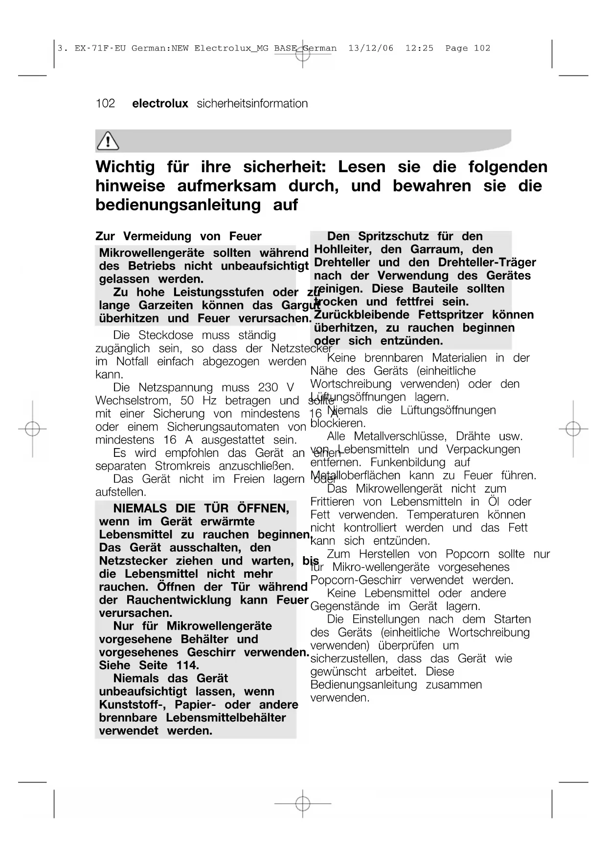 Bitte das Auswechseln durch einen von ELECTROLUX autorisierten Kundendienst vornehmen lassen. Zur Vermeidung von Explosionen und plötzlichem Sieden: Warnung: Speisen in flüssiger und anderer Form dürfen nicht in verschlossenen Gefäßen erhitzt werden, da sie explodieren könnten. Niemals verschlossene Behälter verwenden. Verschlüsse und Abdeckungen entfernen. Verschlossene Behälter können durch den Druckanstieg selbst nach dem Ausschalten des Gerätes noch explodieren. Beim Erhitzen von Flüssigkeiten vorsichtig sein. Behälter mit großer öffnung verwenden, damit entstehende Blasen entweichen können. Beim Erhitzen von Flüssigkeiten in Mikrowellengeräten beim Entnehmen des Behälters vorsichtig sein, da es zu einem verspätetem Aufwallen durch Siedeverzug kommen kann. Um Verbrennungen durch plötzliches Überkochen (Siedeverzug) zu vermeiden: