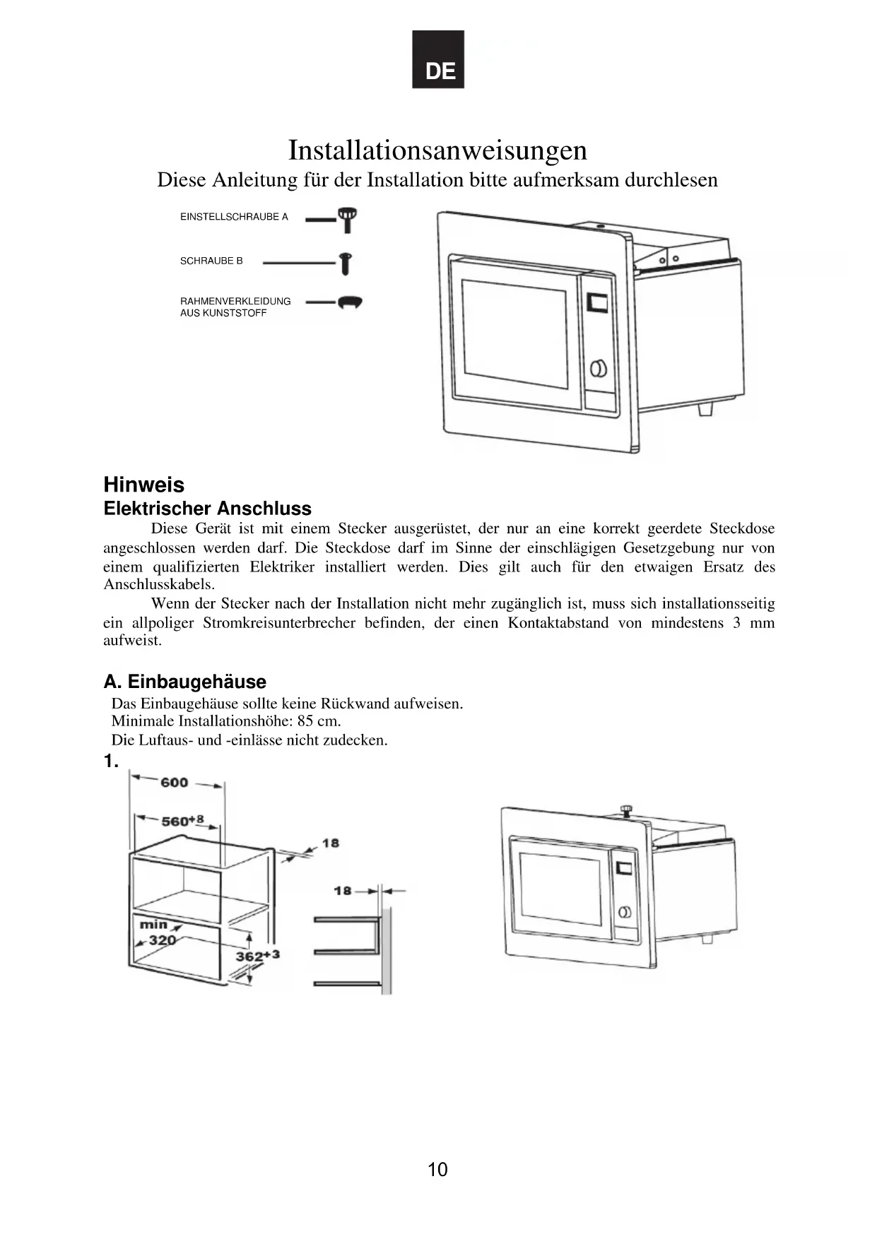 Hinweis Elektrischer Anschluss Diese Gerät ist mit einem Stecker ausgerüstet, der nur an eine korrekt geerdete Steckdose angeschlossen werden darf. Die Steckdose darf im Sinne der einschlägigen Gesetzgebung nur von einem qualifizierten Elektriker installiert werden. Dies gilt auch für den etwaigen Ersatz des Anschlusskabels. Wenn der Stecker nach der Installation nicht mehr zugänglich ist, muss sich installationsseitig ein allpoliger Stromkreisunterbrecher befinden, der einen Kontaktabstand von mindestens 3 mm aufweist. A. Einbaugehäuse Das Einbaugehäuse sollte keine Rückwand aufweisen. Minimale Installationshöhe: 85 cm. Die Luftaus- und -einlässe nicht zudecken.