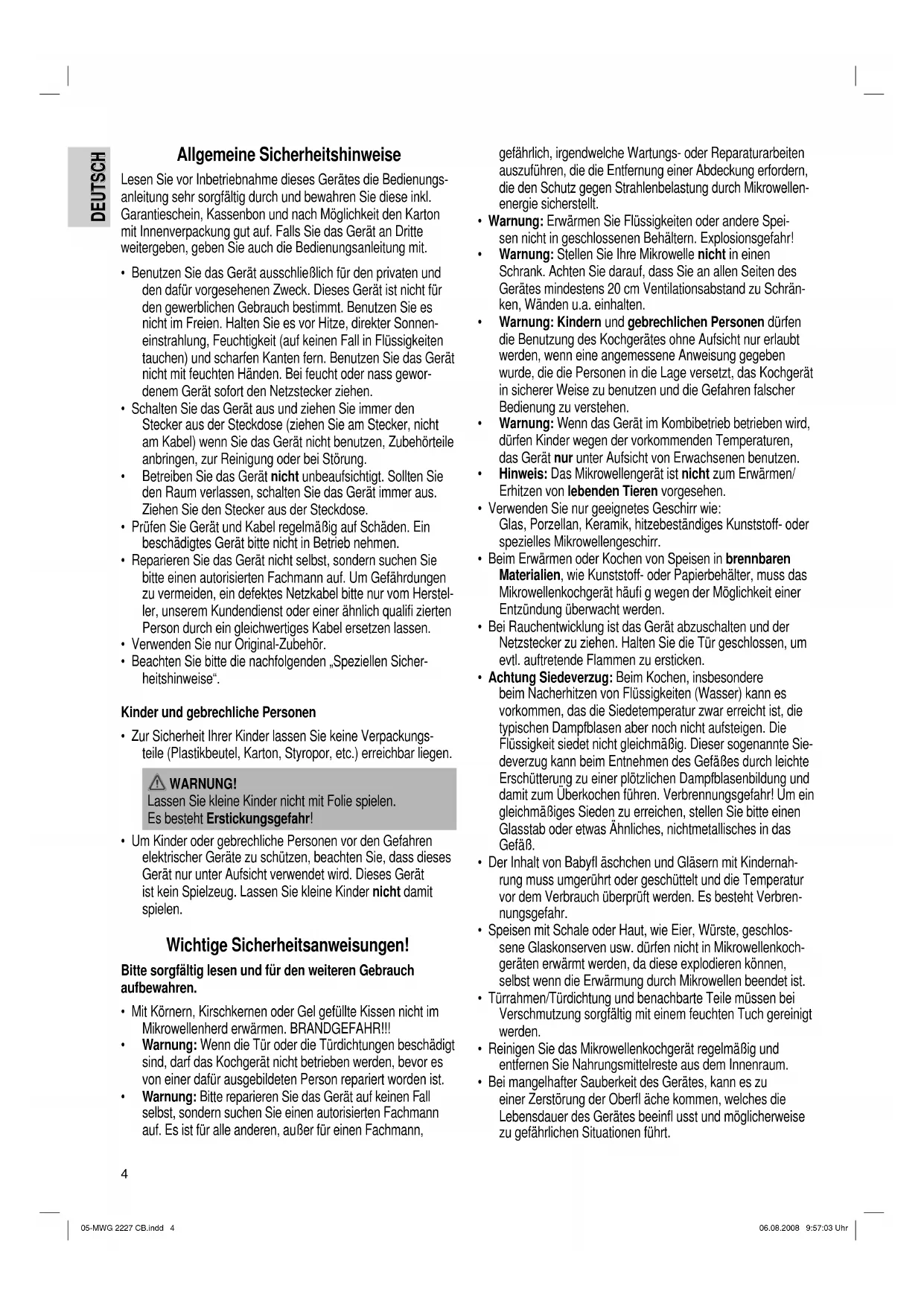 - Ни в коем случае не удаляйте защитную фольгу с внутренней стенки дверцы! 05-MWG 2227 CB.indd 305-MWG 2227 CB.indd 3 06.08.2008 9:57:01 Uhr06.08.2008 9:57:01 Uhr4 DEUTSCH DEUTSCH Allgemeine Sicherheitshinweise Lesen Sie vor Inbetriebnahme dieses Gerätes die Bedienungs- anleitung sehr sorgfältig durch und bewahren Sie diese inkl. Garantieschein, Kassenbon und nach Möglichkeit den Karton mit Innenverpackung gut auf. Falls Sie das Gerät an Dritte weitergeben, geben Sie auch die Bedienungsanleitung mit.