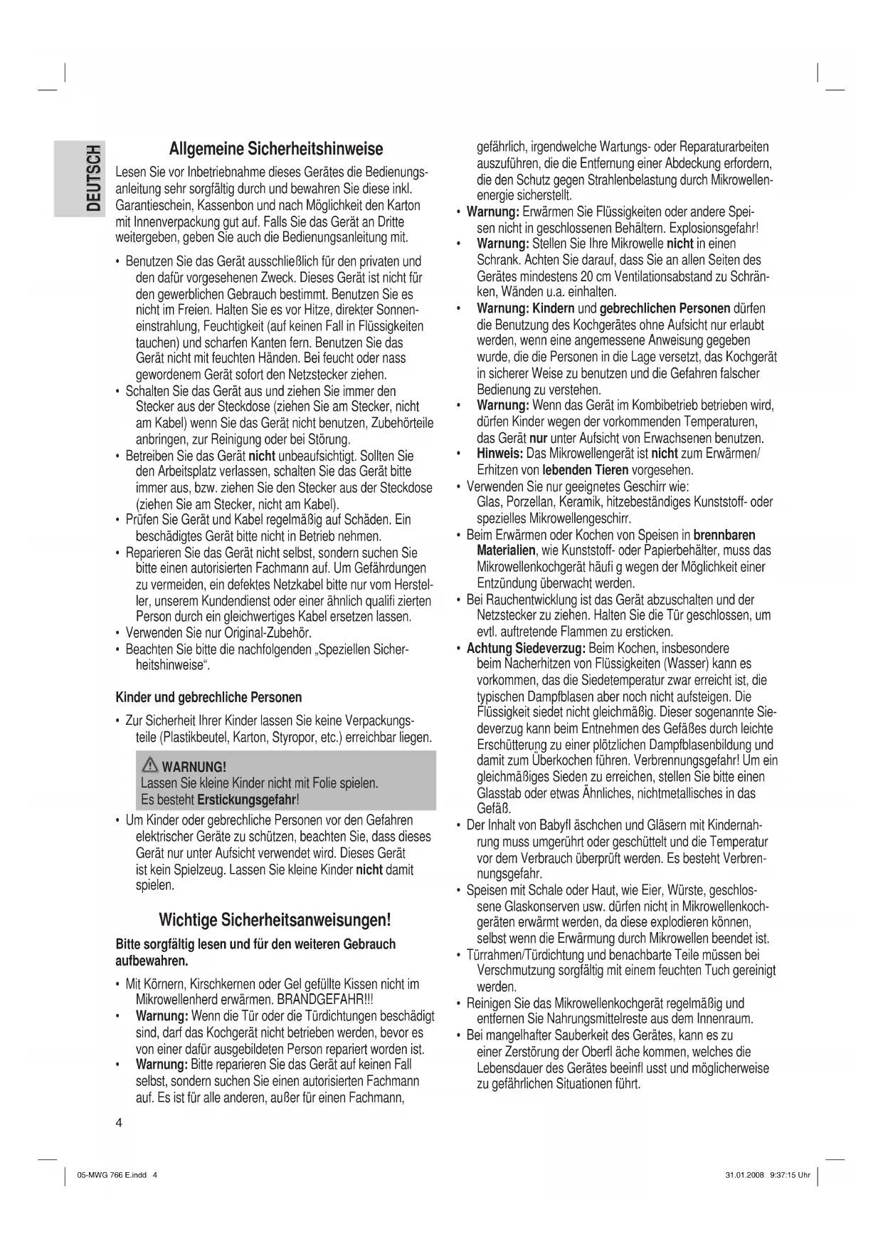 - Bei mangelhafter Sauberkeit des Gerätes, kann es zu einer Zerstörung der Oberfl äche kommen, welches die Lebensdauer des Gerätes beeinfl usst und möglicherweise zu gefährlichen Situationen führt. 05-MWG 766 E.indd 405-MWG 766 E.indd 4 31.01.2008 9:37:15 Uhr31.01.2008 9:37:15 Uhr5 DEUTSCH DEUTSCH