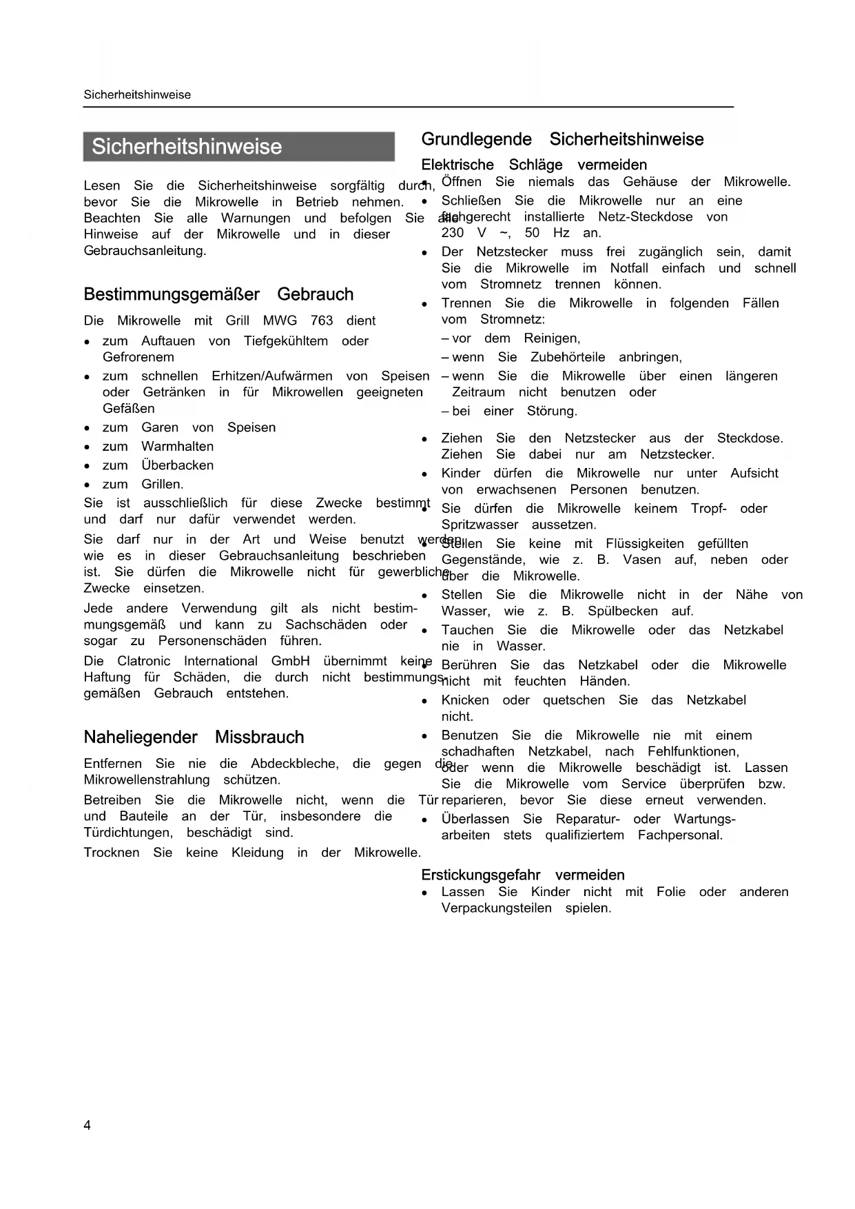 zum Grillen. Sie ist ausschließlich für diese Zwecke bestimmt und darf nur dafür verwendet werden. Sie darf nur in der Art und Weise benutzt werden, wie es in dieser Gebrauchsanleitung beschrieben ist. Sie dürfen die Mikrowelle nicht für gewerbliche Zwecke einsetzen. Jede andere Verwendung gilt als nicht bestim- mungsgemäß und kann zu Sachschäden oder sogar zu Personenschäden führen. Die Clatronic International GmbH übernimmt keine Haftung für Schäden, die durch nicht bestimmungs- gemäßen Gebrauch entstehen. Naheliegender Missbrauch Entfernen Sie nie die Abdeckbleche, die gegen die Mikrowellenstrahlung schützen. Betreiben Sie die Mikrowelle nicht, wenn die Tür und Bauteile an der Tür, insbesondere die Türdichtungen, beschädigt sind. Trocknen Sie keine Kleidung in der Mikrowelle. Grundlegende Sicherheitshinweise Elektrische Schläge vermeiden
