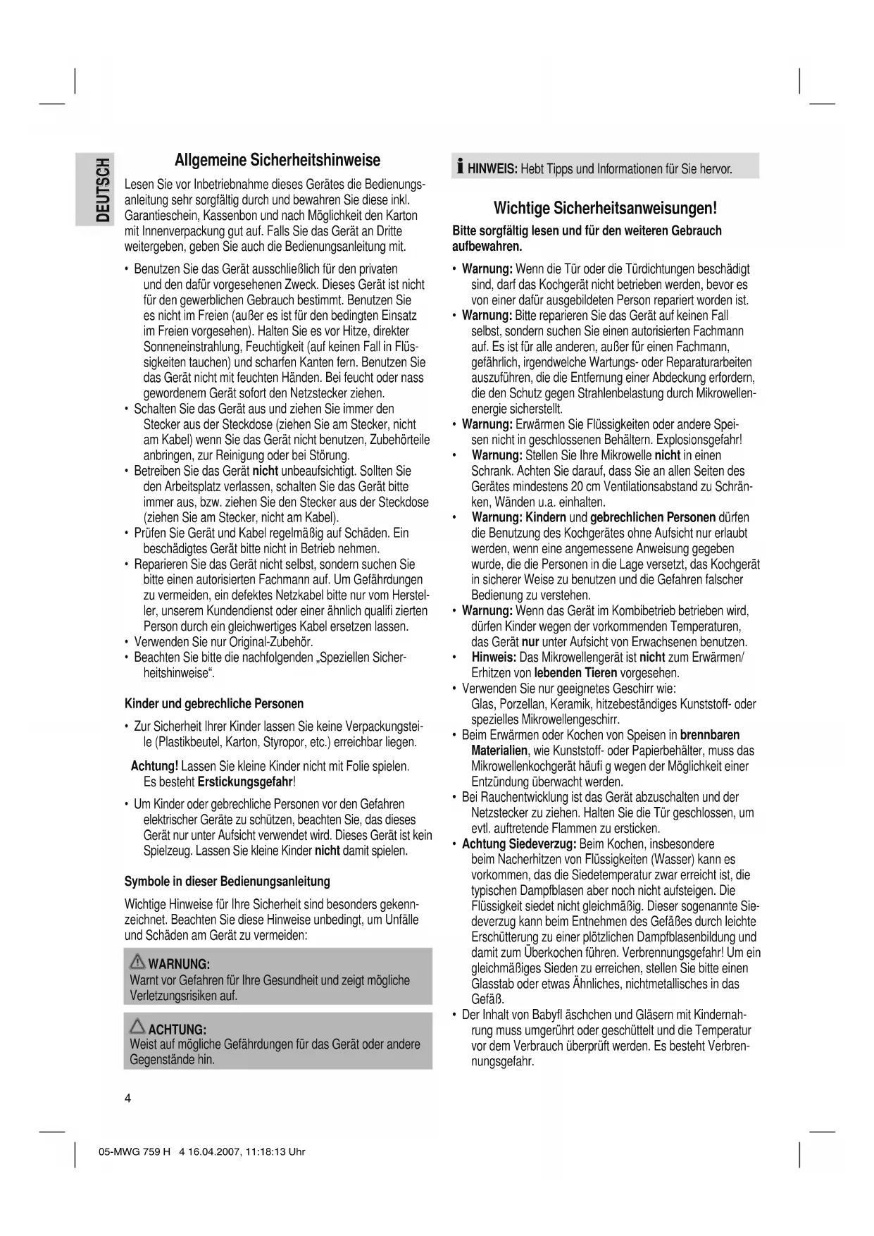 - Der Inhalt von Babyfl äschchen und Gläsern mit Kindernah- rung muss umgerührt oder geschüttelt und die Temperatur vor dem Verbrauch überprüft werden. Es besteht Verbren- nungsgefahr. 05-MWG 759 H 4 16.04.2007, 11:18:13 UhrDEUTSCH