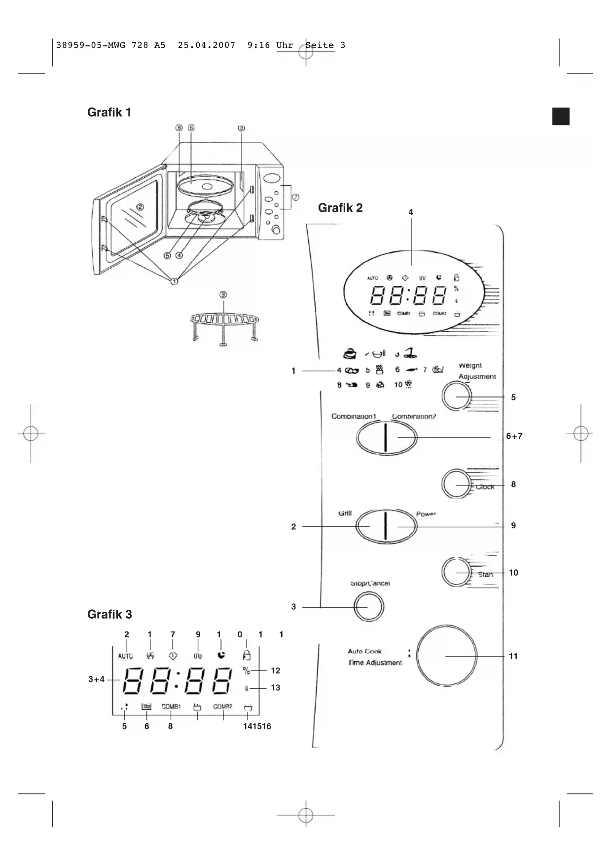 - Benutzen Sie im reinen Mikrowellenbetrieb niemals den Metall-Grillständer. Das Gerät nimmt sonst Schaden. Beschreibung der Bedienelemente Grafik 1:Teilebezeichnung 1 Türverschluss 4 Antriebsachse 7 Bedienfeld 2 Sichtfenster 5 Gleitring 8 Grillheizung 3 Lüftungsgitter 6 Drehteller 9 Grillständer Grafik 2: Bedienfeld