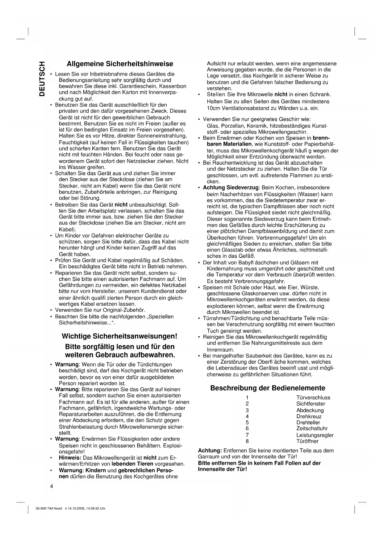 05-MW 749 New2 3 14.10.2005, 14:06:51 Uhr4 DEUTSCH Allgemeine Sicherheitshinweise