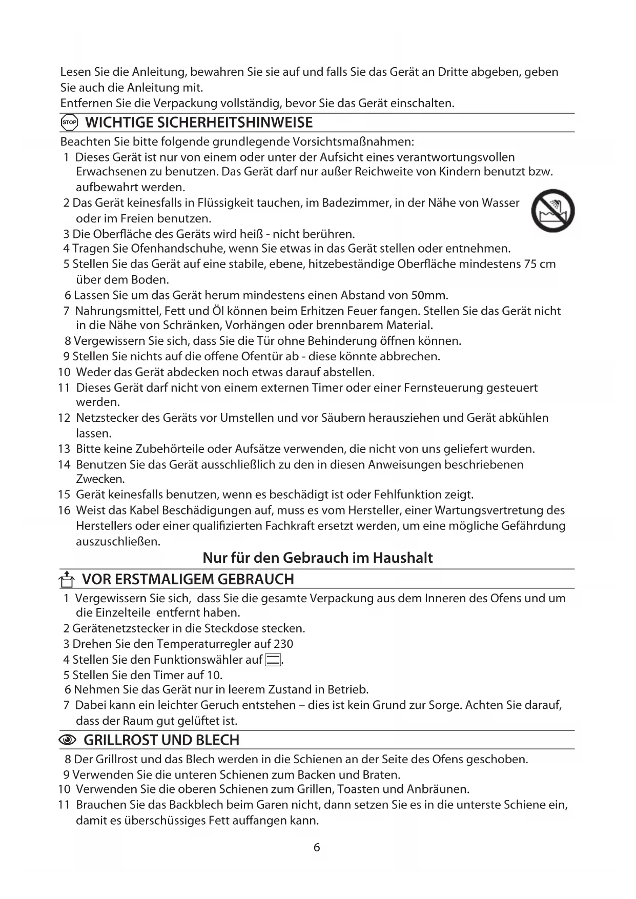 Beachten Sie bitte folgende grundlegende Vorsichtsmaßnahmen: 1 Dieses Gerät ist nur von einem oder unter der Aufsicht eines verantwortungsvollen Erwachsenen zu benutzen. Das Gerät darf nur außer Reichweite von Kindern benutzt bzw. aufbewahrt werden. 2 Das Gerät keinesfalls in Flüssigkeit tauchen, im Badezimmer, in der Nähe von Wasser oder im Freien benutzen. 3 Die Oberfläche des Geräts wird heiß - nicht berühren. 4 Tragen Sie Ofenhandschuhe, wenn Sie etwas in das Gerät stellen oder entnehmen. 5 Stellen Sie das Gerät auf eine stabile, ebene, hitzebeständige Oberfläche mindestens 75 cm über dem Boden. 6 Lassen Sie um das Gerät herum mindestens einen Abstand von 50mm. 7 Nahrungsmittel, Fett und Öl können beim Erhitzen Feuer fangen. Stellen Sie das Gerät nicht in die Nähe von Schränken, Vorhängen oder brennbarem Material. 8 Vergewissern Sie sich, dass Sie die Tür ohne Behinderung öffnen können. 9 Stellen Sie nichts auf die offene Ofentür ab - diese könnte abbrechen. 10 Weder das Gerät abdecken noch etwas darauf abstellen. 11 Dieses Gerät darf nicht von einem externen Timer oder einer Fernsteuerung gesteuert werden. 12 Netzstecker des Geräts vor Umstellen und vor Säubern herausziehen und Gerät abkühlen lassen. 13 Bitte keine Zubehörteile oder Aufsätze verwenden, die nicht von uns geliefert wurden. 14 Benutzen Sie das Gerät ausschließlich zu den in diesen Anweisungen beschriebenen Zwecken. 15 Gerät keinesfalls benutzen, wenn es beschädigt ist oder Fehlfunktion zeigt. 16 Weist das Kabel Beschädigungen auf, muss es vom Hersteller, einer Wartungsvertretung des Herstellers oder einer qualifizierten Fachkraft ersetzt werden, um eine mögliche Gefährdung auszuschließen. Nur für den Gebrauch im Haushalt