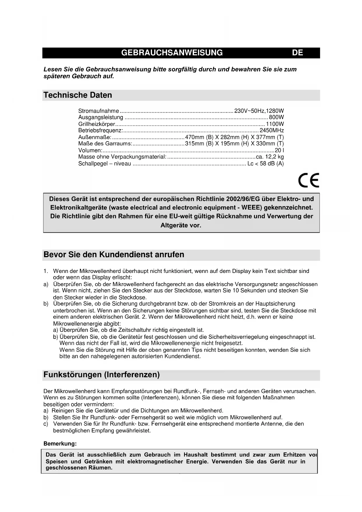 oder wenn das Display erlischt: a) Überprüfen Sie, ob der Mikrowellenherd fachgerecht an das elektrische Versorgungsnetz angeschlossen ist. Wenn nicht, ziehen Sie den Stecker aus der Steckdose, warten Sie 10 Sekunden und stecken Sie den Stecker wieder in die Steckdose. b) Überprüfen Sie, ob die Sicherung durchgebrannt bzw. ob der Stromkreis an der Hauptsicherung unterbrochen ist. Wenn an den Sicherungen keine Störungen sichtbar sind, testen Sie die Steckdose mit einem anderen elektrischen Gerät. 2. Wenn der Mikrowellenherd nicht heizt, d.h. wenn er keine Mikrowellenenergie abgibt: a) Überprüfen Sie, ob die Zeitschaltuhr richtig eingestellt ist. b) Überprüfen Sie, ob die Gerätetür fest geschlossen und die Sicherheitsverriegelung eingeschnappt ist. Wenn das nicht der Fall ist, wird die Mikrowellenenergie nicht freigesetzt. Wenn Sie die Störung mit Hilfe der oben genannten Tips nicht beseitigen konnten, wenden Sie sich bitte an den nahegelegenen autorisierten Kundendienst. Funkstörungen (Interferenzen) Der Mikrowellenherd kann Empfangsstörungen bei Rundfunk-, Fernseh- und anderen Geräten verursachen. Wenn es zu Störungen kommen sollte (Interferenzen), können Sie diese mit folgenden Maßnahmen beseitigen oder vermindern: a) Reinigen Sie die Gerätetür und die Dichtungen am Mikrowellenherd. b) Stellen Sie Ihr Rundfunk- oder Fernsehgerät so weit wie möglich vom Mikrowellenherd auf. c) Verwenden Sie für Ihr Rundfunk- bzw. Fernsehgerät eine entsprechend montierte Antenne, die den bestmöglichen Empfang gewährleistet. Bemerkung: Das Gerät ist ausschließlich zum Gebrauch im Haushalt bestimmt und zwar zum Erhitzen von Speisen und Getränken mit elektromagnetischer Energie. Verwenden Sie das Gerät nur in geschlossenen Räumen. Dieses Gerät ist entsprechend der europäischen Richtlinie 2002/96/EG über Elektro- und Elektronikaltgeräte (waste electrical and electronic equipment - WEEE) gekennzeichnet. Die Richtlinie gibt den Rahmen für eine EU-weit gültige Rücknahme und Verwertung der Altgeräte vor.35 Aufstellung