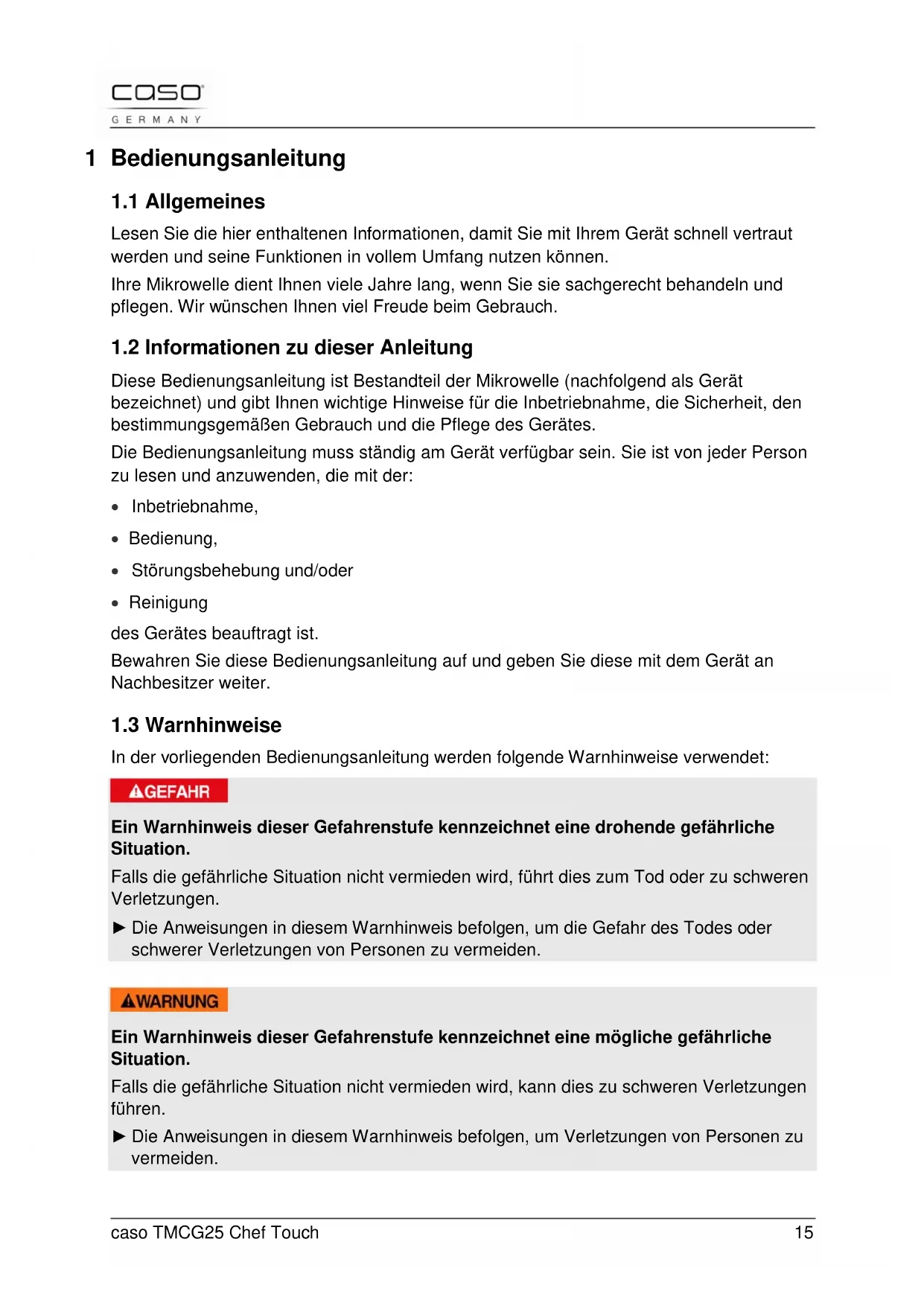 Ein Warnhinweis dieser Gefahrenstufe kennzeichnet eine mögliche gefährliche Situation. Falls die gefährliche Situation nicht vermieden wird, kann dies zu schweren Verletzungen führen. ► Die Anweisungen in diesem Warnhinweis befolgen, um Verletzungen von Personen zu vermeiden.caso TMCG25 Chef Touch 16