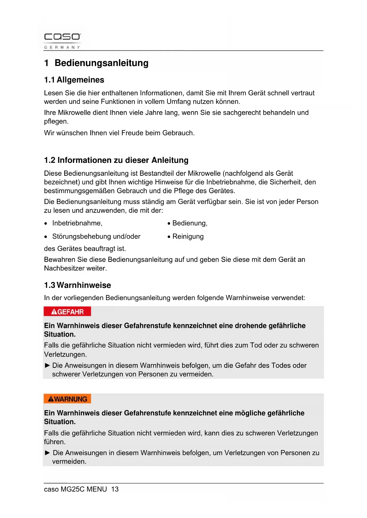 Ein Warnhinweis dieser Gefahrenstufe kennzeichnet eine mögliche gefährliche Situation. Falls die gefährliche Situation nicht vermieden wird, kann dies zu schweren Verletzungen führen. ► Die Anweisungen in diesem Warnhinweis befolgen, um Verletzungen von Personen zu vermeiden.caso MG25C MENU 14 Ein Warnhinweis dieser Gefahrenstufe kennzeichnet eine mögliche gefährliche Situation. Falls die gefährliche Situation nicht vermieden wird, kann dies zu leichten oder gemäßigten Verletzungen führen. ► Die Anweisungen in diesem Warnhinweis befolgen, um Verletzungen von Personen zu vermeiden.