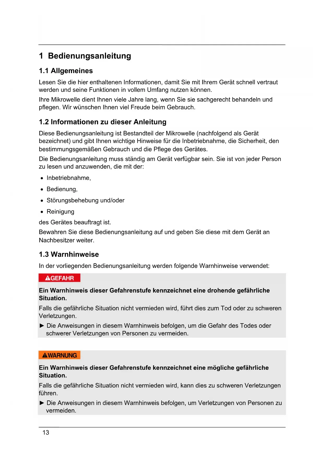 Diese Bedienungsanleitung ist Bestandteil der Mikrowelle (nachfolgend als Gerät bezeichnet) und gibt Ihnen wichtige Hinweise für die Inbetriebnahme, die Sicherheit, den bestimmungsgemäßen Gebrauch und die Pflege des Gerätes. Die Bedienungsanleitung muss ständig am Gerät verfügbar sein. Sie ist von jeder Person zu lesen und anzuwenden, die mit der: Inbetriebnahme, Bedienung, Störungsbehebung und/oder Reinigung des Gerätes beauftragt ist. Bewahren Sie diese Bedienungsanleitung auf und geben Sie diese mit dem Gerät an Nachbesitzer weiter.
