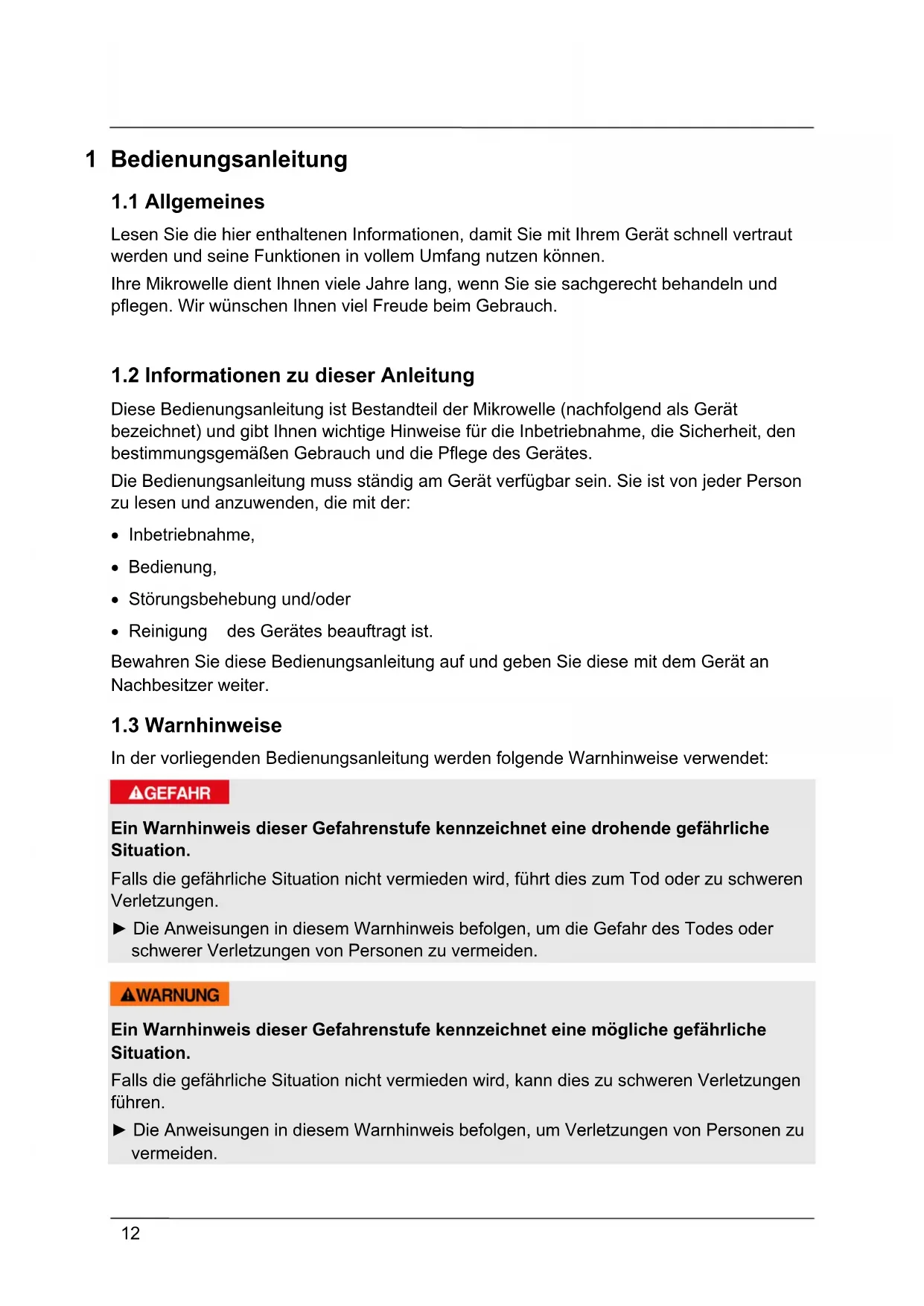 Diese Bedienungsanleitung ist Bestandteil der Mikrowelle (nachfolgend als Gerät bezeichnet) und gibt Ihnen wichtige Hinweise für die Inbetriebnahme, die Sicherheit, den bestimmungsgemäßen Gebrauch und die Pflege des Gerätes. Die Bedienungsanleitung muss ständig am Gerät verfügbar sein. Sie ist von jeder Person zu lesen und anzuwenden, die mit der: Inbetriebnahme, Bedienung, Störungsbehebung und/oder Reinigung des Gerätes beauftragt ist. Bewahren Sie diese Bedienungsanleitung auf und geben Sie diese mit dem Gerät an Nachbesitzer weiter.