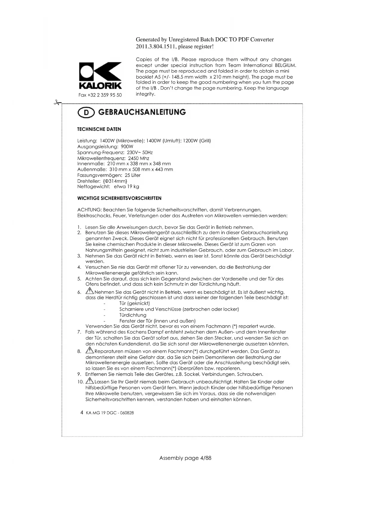 SICHERHEITSVERSCHLUSS Der Sicherheitsverschluss verhindert, dass Kinder oder hilfsbedürftige Personen das Gerät unbeaufsichtigt benutzen. Um den Sicherheitsverschluss einzuschalten: Drücken Sie während 3 Sekunden auf RESET. Sie werden einen Tonsignal hören, und die Kontrollleuchte wird aufleuchten. In diesem Zustand sind alle Tasten versperrt. Um den Sicherheitsverschluss auszuschalten: Drücken Sie während 3 Sekunden auf RESET. Sie werden einen Tonsignal hören, und die Kontrollleuchte wird ausgehen. SCHNELLSTARTFUNKTION (QUICK START) Benutzen Sie diese Funktion, um die Mikrowellefunktion bei 100% Leistung einfach zu programmieren. Drücken Sie einige Male auf START um die Garzeit einzustellen. Sie maximale Garzeit ist 10 Minuten. Der Ofen wird 2 Sekunden später automatisch starten. Nach Ablauf der Garzeit werden Sie 4 Tonsignale hören und wird END im Display erscheinen. Bevor Sie ein anderes Garprogramm einstellen, ist es notwendig das Display und das System zur AnfangspositionGenerated by Unregistered Batch DOC TO PDF Converter 2011.3.804.1511, please register! Copies of the I/B. Please reproduce them without any changes except under special instruction from Team International BELGIUM. The page must be reproduced and folded in order to obtain a mini booklet A5 (+/- 148.5 mm width x 210 mm height). The page must be folded in order to keep the good numbering when you turn the page of the I/B . Don‟t change the page numbering. Keep the language integrity.