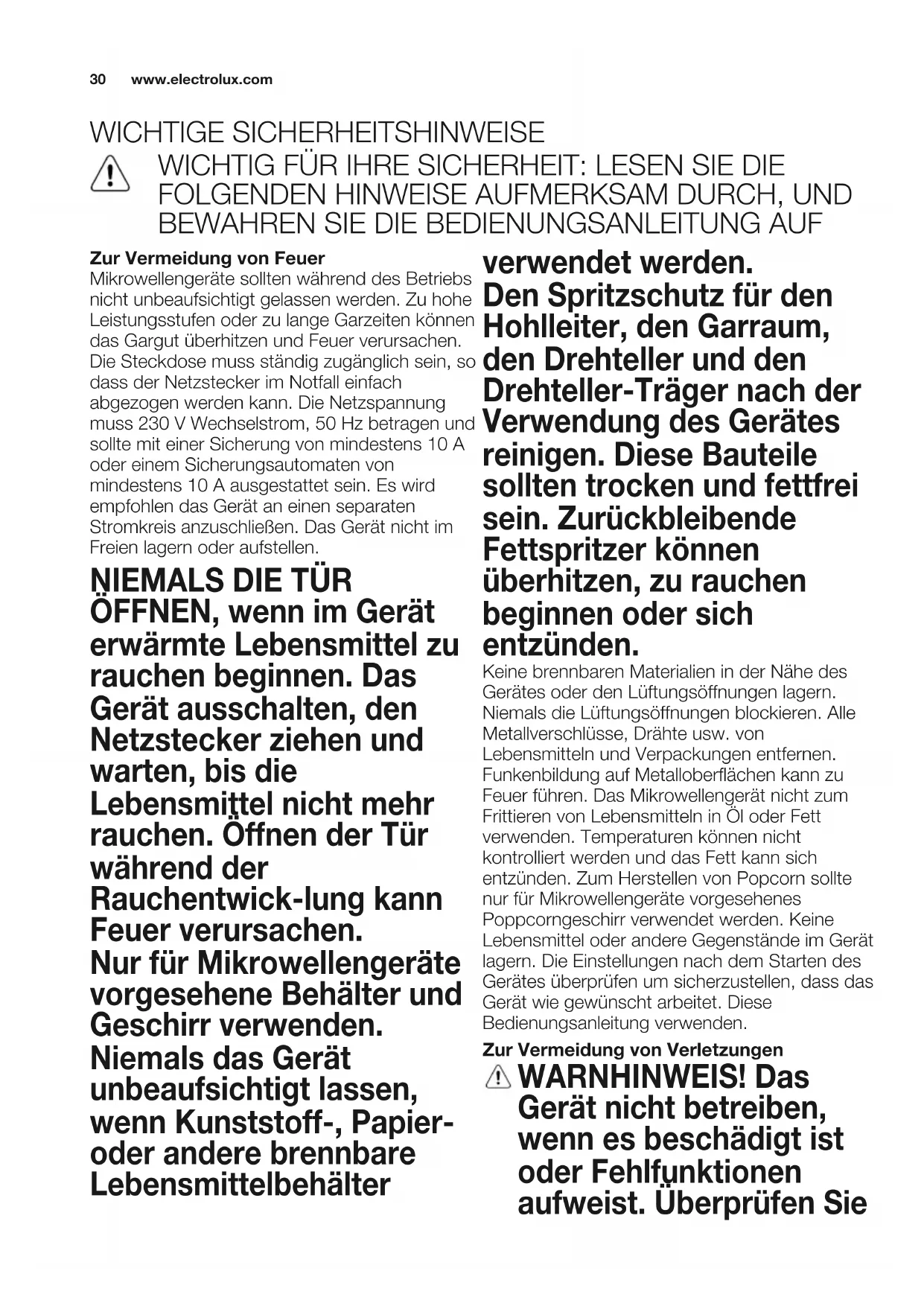 vor dem Betrieb die folgenden Punkte: a) Die Tür muss einwandfrei schließen und darf nicht schlecht ausgerichtet oder verzogen sein. b)Die Scharniere und Türsicherheitsverriegelun gen dürfen nicht gebrochen oder lose sein. c) Die Türdichtungen und Dichtungsoberflächen dürfen nicht beschädigt sein. d) Im Garraum und an der Tür dürfen keine Dellen oder andere Beschä- digungen vorhanden sein. e) Das Netzkabel und der Netzstecker dürfen nicht beschädigt sein. Nehmen Sie unter keinen Umständen Reparaturen oder Änderungen an Ihrem Mikrowellengerät selbst vor. Reparaturen, insbesondere solche, bei denen die Abdeckung des Geräts entfernt werden muss, dürfen ausschließlich von entsprechend qualifizierten Technikern vorgenommen werden. 4F 8E`GA<6;G58<:8c99A8G8E-dEB78E@<G4H9 <E:8A78<A808<F8I8E`A78EG8E -dEF<6;8E;8<GFI8EE<8:8?HA:58GE8<58A'<8@4?F 74F 8E`G58GE8<58AJ8AAF<6; 8:8AFG`A78 MJ<F6;8A78A-dE7<6;GHA:8AHA778A 457<6;G8A78A(58ER`6;8A58QA78A Darauf achten, dass sich weder Fett noch Schmutz auf den Türdich-tungen bzw. den benachbarten Geräteteilen ansammeln. Befolgen Sie die Hinweise unter "Reinigung & Pflege". Wird das Gerät nicht saubergehalten, kann dies die Oberfläche beeinträchtigen und sich negativ auf die Lebensdauer des Geräts auswirken. Schlimmstenfalls kann die Sicherheit des Geräts beeinträchtigt werden. )8EFBA8A@<G!+2,!+"--&!+'FB??G8A <;E8AEMGB78E78A!8EFG8??8E78F !8EMF6;E<GG@46;8EFA46;/BEF<6;GF@4YA4;@8A 58<@.@:4A:@<G&<>EBJ8??8A:8E`G8A589E4:8A Zur Vermeidung von elektrischem Stromschlag .AG8E>8<A8A.@FG`A78AFB??G874F`HY8E8 8;`HF88AG98EAGJ8E78A'<8@4?F?dFF<:>8<G8A <A7<8^99AHA:8A78E-dEF<6;8E;8<GFI8EE<8:8?HA: B78E%d9GHA:Fc99AHA:8A>B@@8A?4FF8AB78E 8:8AFG`A78<A7<8F8^99AHA:8AFG86>8A08AA :EcY8E8&8A:8A?dFF<:>8<G8AI8EF6;dGG8G J8E78A@dFF8A,<8FB9BEG74F 8E`G 4HFF6;4?G8A78A'8GMFG86>8EM<8;8AHA778A %-+(%.14HGBE<F<8EG8A$HA78A7<8AFG 4A9BE78EA'<8@4?F74F'8GM>458?5MJ78A '8GMFG86>8E<A04FF8EB78E4A78E8?dFF<:>8<G8Awww.electrolux.com
