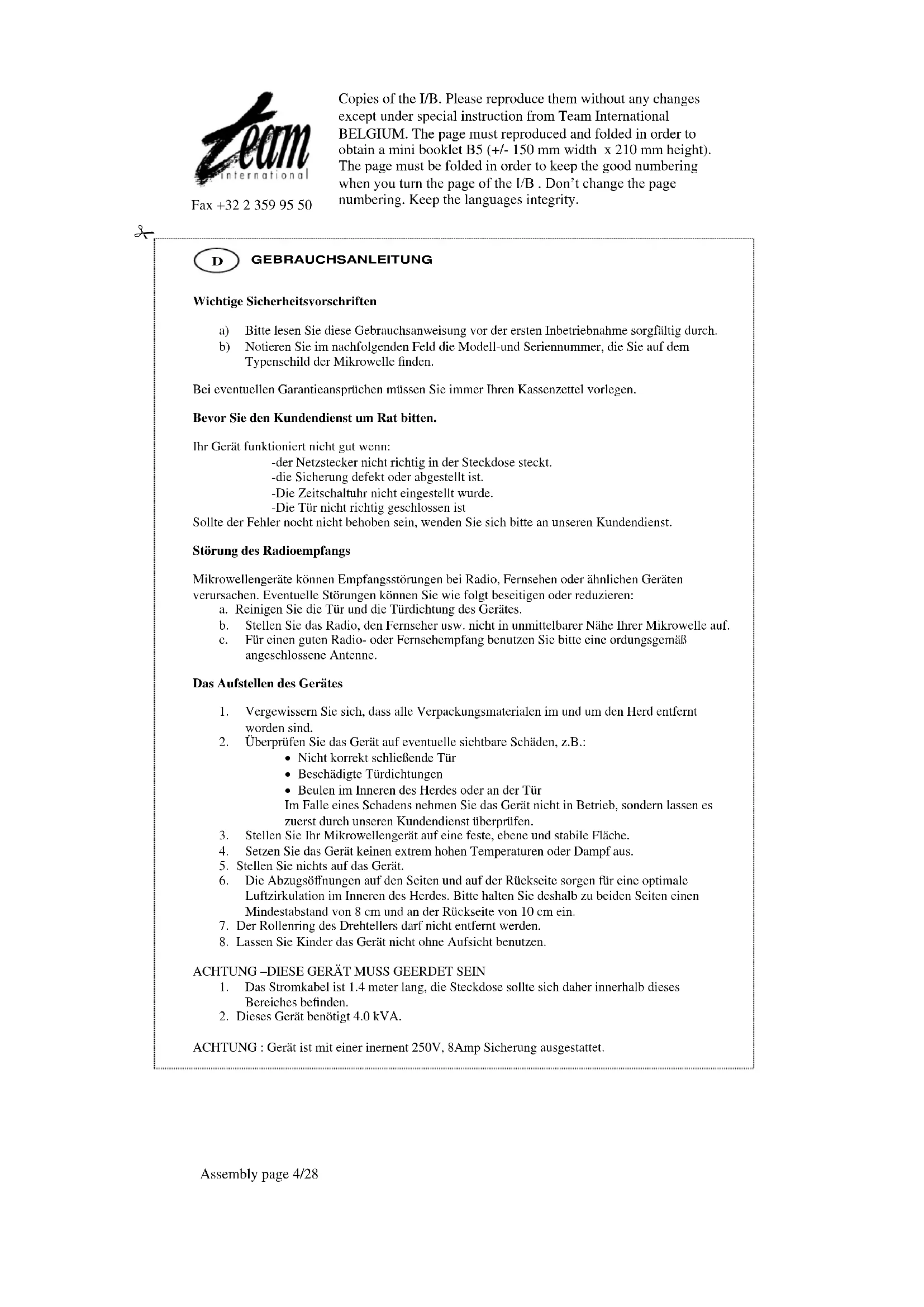 -Gefäße aus Metall und Gefäße mit Metallgriffen -Gefäße mit Metallbearbeitung -Plastikbeutel mit papierumwickelten Drahtverschlüssen -Melamingefäße, da diese ein Material enthalten, das Mikrowellen absorbiert. Die Gefäße können bersten oder austrocknen und der Garprozess wird verlangsamt. -Centura Geschirr und Corelle Livingware Artikel -Gefäße mit einer schmalen Öffnung, z.B. Cola- oder Salatflaschen -Fleischthermometer; im einschlägigen Fachhandel sind Mikrowellenthermometer erhältlich. 12. Mikrowellengeschirr sollte nur den Herstellervorschriften entsprechend benutzt werden.Copies of the I/B. Please reproduce them without any changes except under special instruction from Team International BELGIUM. The page must reproduced and folded in order to obtain a mini booklet B5 (+/- 150 mm width x 210 mm height). The page must be folded in order to keep the good numbering when you turn the page of the I/B . Don’t change the page numbering. Keep the languages integrity.
