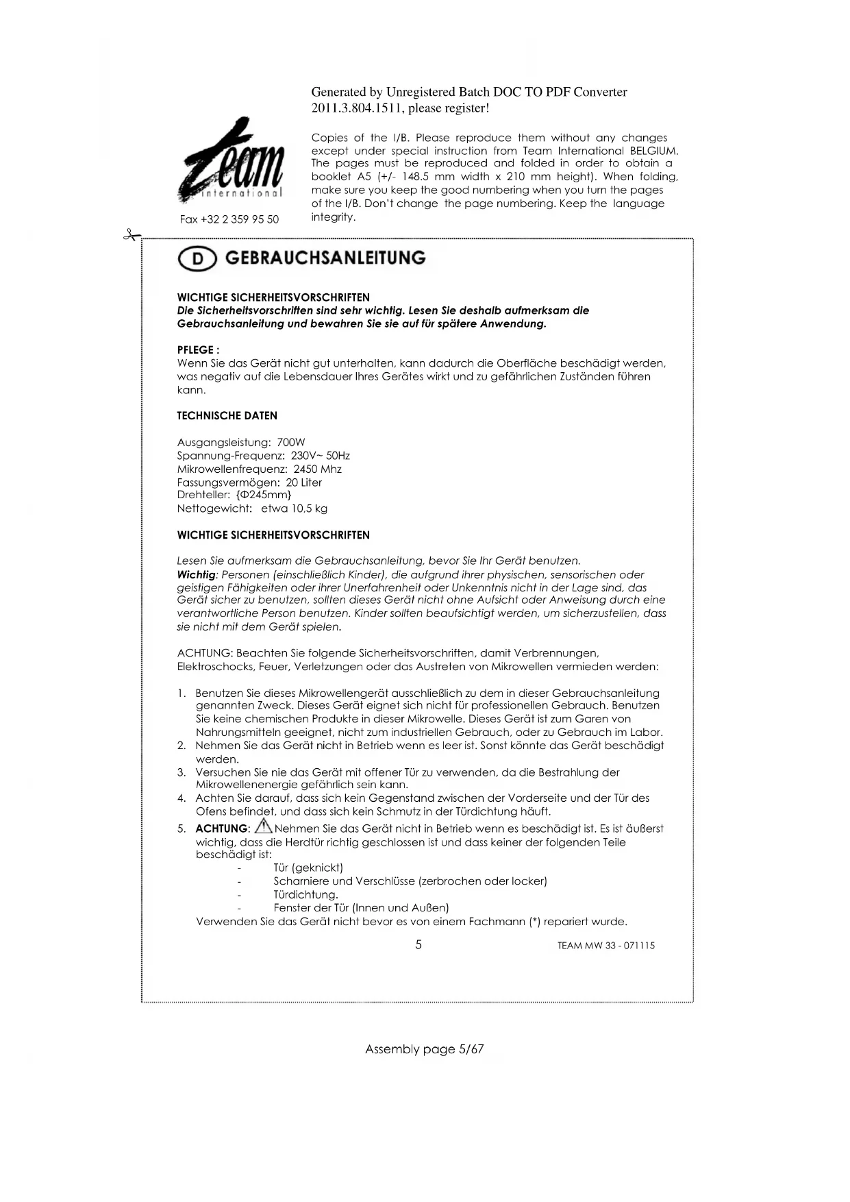 ACHTUNG: DIESES GERÄT MUSS GEERDET SEIN. Die Anschlussleitung ist 1,4 Meter lang, die Steckdose sollte sich daher innerhalb dieses Bereiches befinden. Für mehr Auskünfte oder Hilfe für die technische Installation Ihres Gerätes, wenden Sie sich an einen Fachmann.Generated by Unregistered Batch DOC TO PDF Converter 2011.3.804.1511, please register! Copies of the I/B. Please reproduce them without any changes except under special instruction from Team International BELGIUM. The pages must be reproduced and folded in order to obtain a booklet A5 (+/- 148.5 mm width x 210 mm height). When folding, make sure you keep the good numbering when you turn the pages of the I/B. Don‟t change the page numbering. Keep the language integrity.