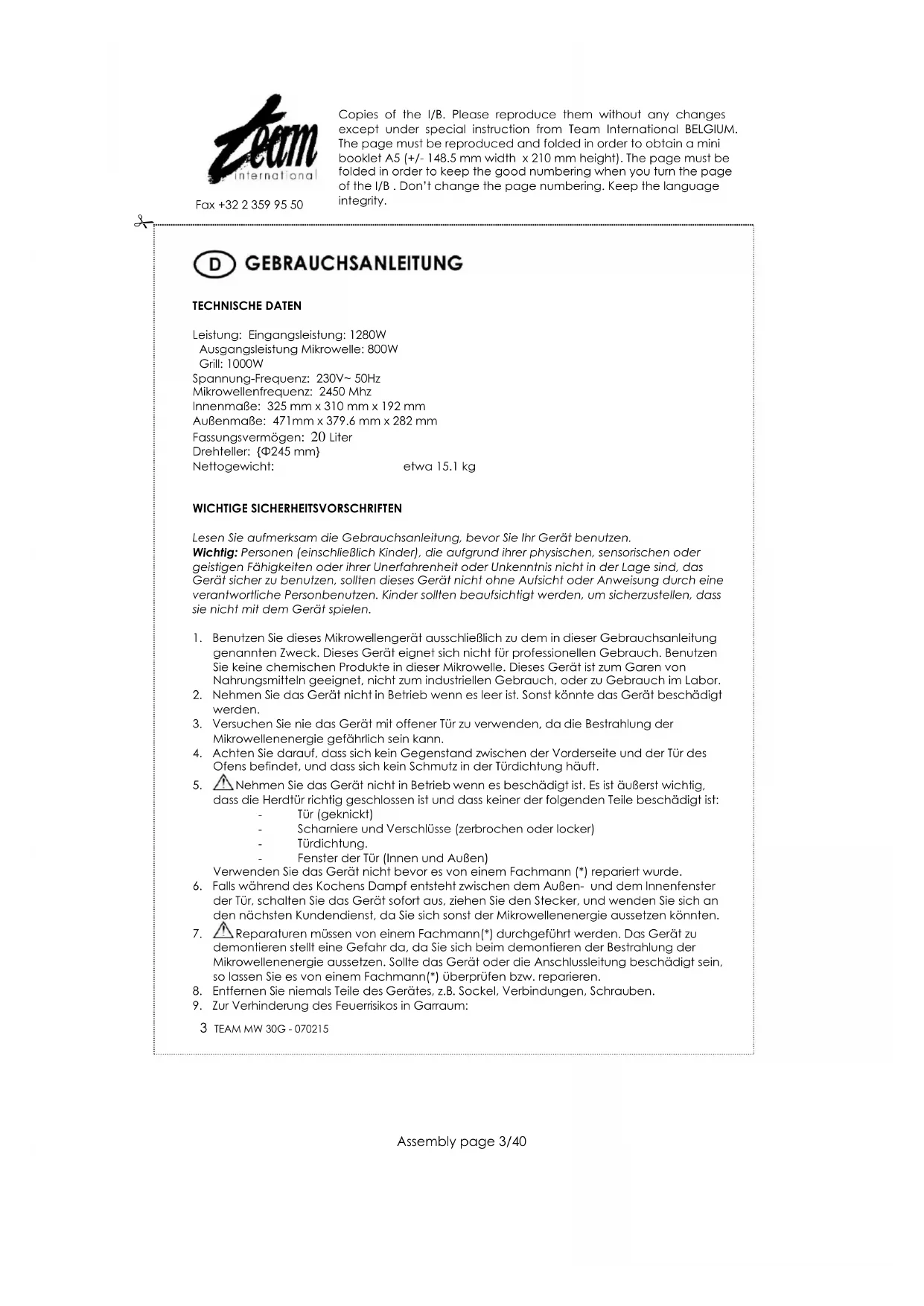 Zum Schutz unserer Umwelt und unserer Gesundheit sind Elektro- und Elektronik-Altgeräte nach bestimmten Regeln zu entsorgen. Dies fordert den Einsatz sowohl des Herstellers bzw. Lieferanten als auch des Verbrauchers. Aus diesem Grund darf dieses Gerät, wie das Symbol auf dem Typenschild bzw. auf der Verpackung zeigt, nicht in den unsortierten Restmüll gegeben werden. Der Verbraucher hat das Recht, dieses Gerät über kommunale Sammelstellen zu entsorgen; von dort aus wird die spezifische Behandlung, Verwertung bzw. das Recycling gem. den Erfordernissen der Richtlinie sichergestellt.Copies of the I/B. Please reproduce them without any changes except under special instruction from Team International BELGIUM. The page must be reproduced and folded in order to obtain a mini booklet A5 (+/- 148.5 mm width x 210 mm height). The page must be folded in order to keep the good numbering when you turn the page of the I/B . Don‟t change the page numbering. Keep the language integrity.