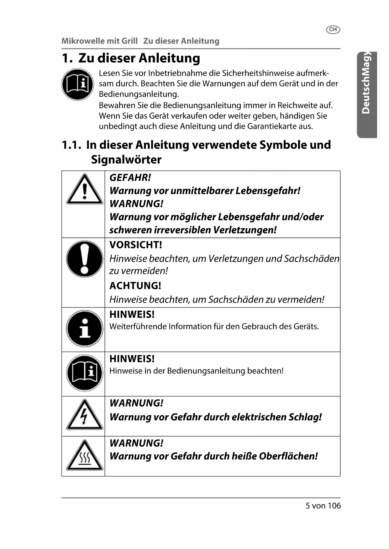 Lesen Sie vor Inbetriebnahme die Sicherheitshinweise aufmerk- sam durch. Beachten Sie die Warnungen auf dem Gerät und in der Bedienungsanleitung. Bewahren Sie die Bedienungsanleitung immer in Reichweite auf. Wenn Sie das Gerät verkaufen oder weiter geben, händigen Sie unbedingt auch diese Anleitung und die Garantiekarte aus. 1.1. In dieser Anleitung verwendete Symbole und Signalwörter GEFAHR! Warnung vor unmittelbarer Lebensgefahr! WARNUNG! Warnung vor möglicher Lebensgefahr und/oder schweren irreversiblen Verletzungen! VORSICHT! Hinweise beachten, um Verletzungen und Sachschäden zu vermeiden! ACHTUNG! Hinweise beachten, um Sachschäden zu vermeiden! HINWEIS! Weiterführende Information für den Gebrauch des Geräts. HINWEIS! Hinweise in der Bedienungsanleitung beachten! WARNUNG! Warnung vor Gefahr durch elektrischen Schlag! WARNUNG! Warnung vor Gefahr durch heiße Oberflächen! 14482_50044788 ALDI CH content Final REV1.indb 514482_50044788 ALDI CH content Final REV1.indb 5 22.07.2013 08:58:0622.07.2013 08:58:06CH Bestimmungsgemäßer Gebrauch Mikrowelle mit Grill 6 von 106
