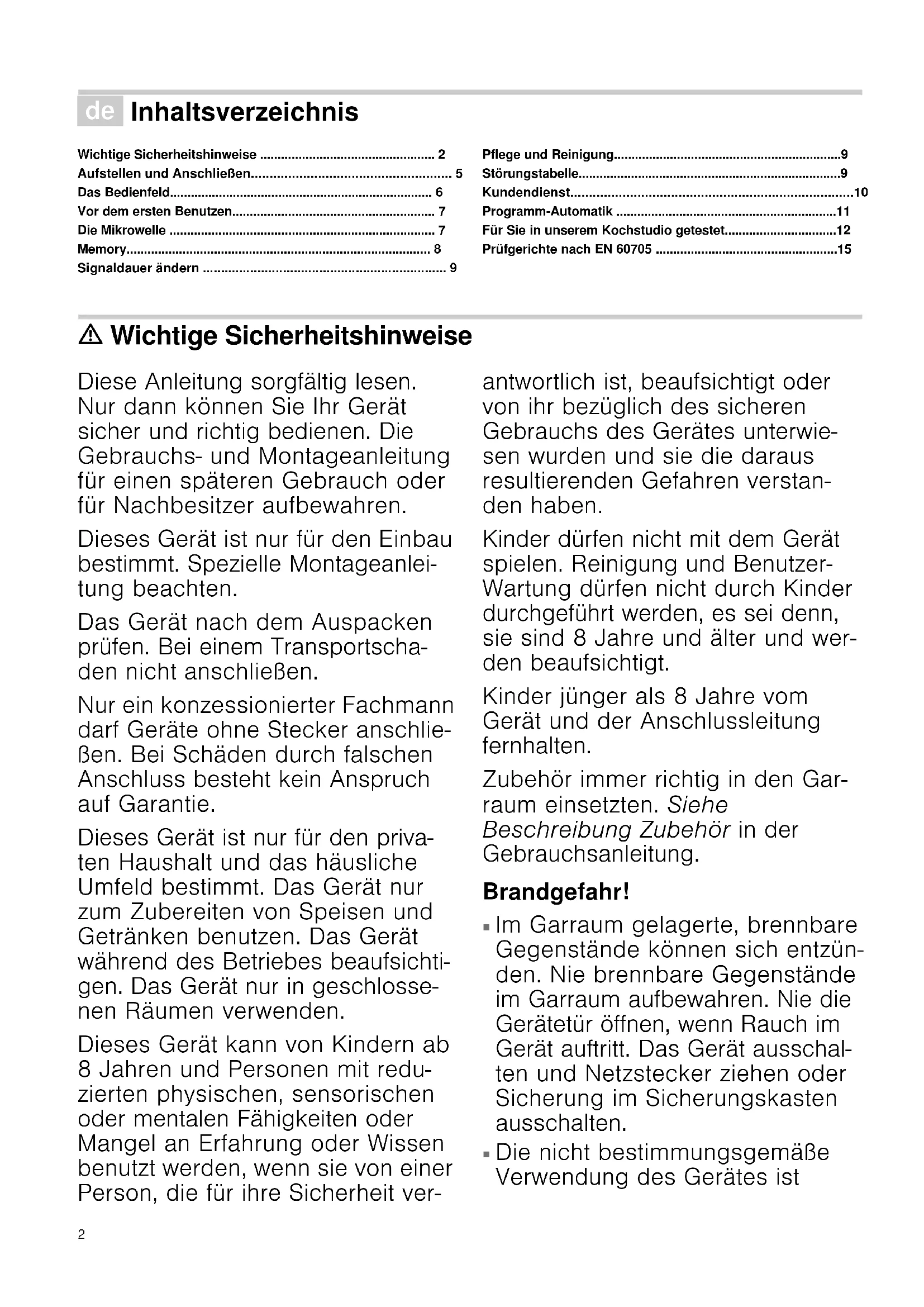 - Prüfgerichte nach EN 60705 ã=Wichtige Sicherheitshinweise Diese Anleitung sorgfältig lesen. Nur dann können Sie Ihr Gerät sicher und richtig bedienen. Die Gebrauchs- und Montageanleitung für einen späteren Gebrauch oder für Nachbesitzer aufbewahren. Dieses Gerät ist nur für den Einbau bestimmt. Spezielle Montageanlei- tung beachten. Das Gerät nach dem Auspacken prüfen. Bei einem Transportscha- den nicht anschließen. Nur ein konzessionierter Fachmann darf Geräte ohne Stecker anschlie- ßen. Bei Schäden durch falschen Anschluss besteht kein Anspruch auf Garantie. Dieses Gerät ist nur für den priva- ten Haushalt und das häusliche Umfeld bestimmt. Das Gerät nur zum Zubereiten von Speisen und Getränken benutzen. Das Gerät während des Betriebes beaufsichti- gen. Das Gerät nur in geschlosse- nen Räumen verwenden. Dieses Gerät kann von Kindern ab 8 Jahren und Personen mit redu- zierten physischen, sensorischen oder mentalen Fähigkeiten oder Mangel an Erfahrung oder Wissen benutzt werden, wenn sie von einer Person, die für ihre Sicherheit ver- antwortlich ist, beaufsichtigt oder von ihr bezüglich des sicheren Gebrauchs des Gerätes unterwie- sen wurden und sie die daraus resultierenden Gefahren verstan- den haben. Kinder dürfen nicht mit dem Gerät spielen. Reinigung und Benutzer- Wartung dürfen nicht durch Kinder durchgeführt werden, es sei denn, sie sind 8 Jahre und älter und wer- den beaufsichtigt. Kinder jünger als 8 Jahre vom Gerät und der Anschlussleitung fernhalten. Zubehör immer richtig in den Gar- raum einsetzten. Siehe Beschreibung Zubehör in der Gebrauchsanleitung. Brandgefahr! p. 15