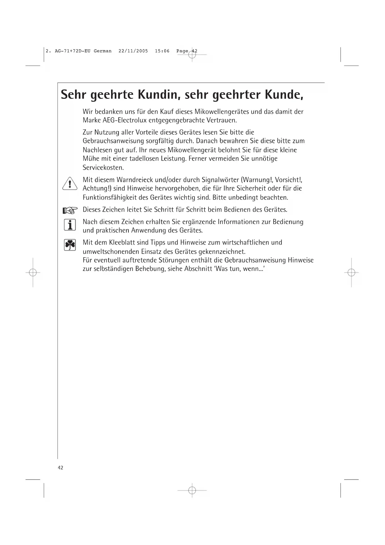 Sehr geehrte Kundin, sehr geehrter Kunde, Wir bedanken uns für den Kauf dieses Mikowellengerätes und das damit der Marke AEG-Electrolux entgegengebrachte Vertrauen. Zur Nutzung aller Vorteile dieses Gerätes lesen Sie bitte die Gebrauchsanweisung sorgfältig durch. Danach bewahren Sie diese bitte zum Nachlesen gut auf. Ihr neues Mikowellengerät belohnt Sie für diese kleine Mühe mit einer tadellosen Leistung. Ferner vermeiden Sie unnötige Servicekosten. Mit diesem Warndreieck und/oder durch Signalwörter (Warnung!, Vorsicht!, Achtung!) sind Hinweise hervorgehoben, die für Ihre Sicherheit oder für die Funktionsfähigkeit des Gerätes wichtig sind. Bitte unbedingt beachten. Dieses Zeichen leitet Sie Schritt für Schritt beim Bedienen des Gerätes. Nach diesem Zeichen erhalten Sie ergänzende Informationen zur Bedienung und praktischen Anwendung des Gerätes. Mit dem Kleeblatt sind Tipps und Hinweise zum wirtschaftlichen und umweltschonenden Einsatz des Gerätes gekennzeichnet. Für eventuell auftretende Störungen enthält die Gebrauchsanweisung Hinweise zur selbständigen Behebung, siehe Abschnitt ‘Was tun, wenn...’