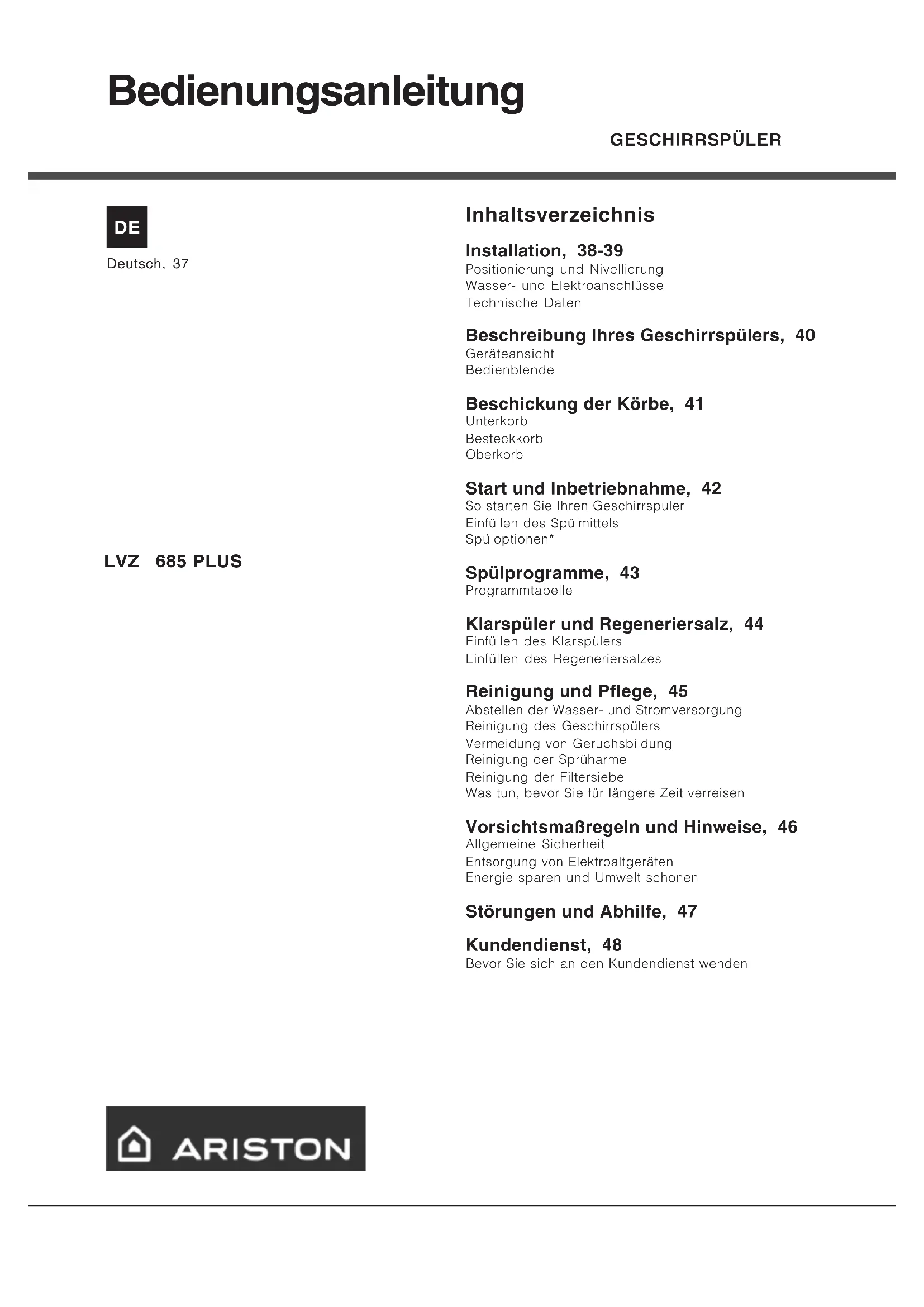 - le numéro de série (S/N) Vous trouverez ces renseignements sur l'étiquette signalétique appliquée sur le côté de la porte inox (voir Description du lave-vaisselle).GESCHIRRSPÜLER Inhaltsverzeichnis Installation, 38-39 Positionierung und Nivellierung Wasser- und Elektroanschlüsse Technische Daten Beschreibung Ihres Geschirrspülers, 40 Geräteansicht Bedienblende Beschickung der Körbe, 41 Unterkorb Besteckkorb Oberkorb Start und Inbetriebnahme, 42 So starten Sie Ihren Geschirrspüler Einfüllen des Spülmittels Spüloptionen* Spülprogramme, 43 Programmtabelle Klarspüler und Regeneriersalz, 44 Einfüllen des Klarspülers Einfüllen des Regeneriersalzes Reinigung und Pflege, 45 Abstellen der Wasser- und Stromversorgung Reinigung des Geschirrspülers Vermeidung von Geruchsbildung Reinigung der Sprüharme Reinigung der Filtersiebe Was tun, bevor Sie für längere Zeit verreisen Vorsichtsmaßregeln und Hinweise, 46 Allgemeine Sicherheit Entsorgung von Elektroaltgeräten Energie sparen und Umwelt schonen Störungen und Abhilfe, 47 Kundendienst, 48 Bevor Sie sich an den Kundendienst wenden Deutsch, 37 D E Bedienungsanleitung LVZ 685 PLUS38