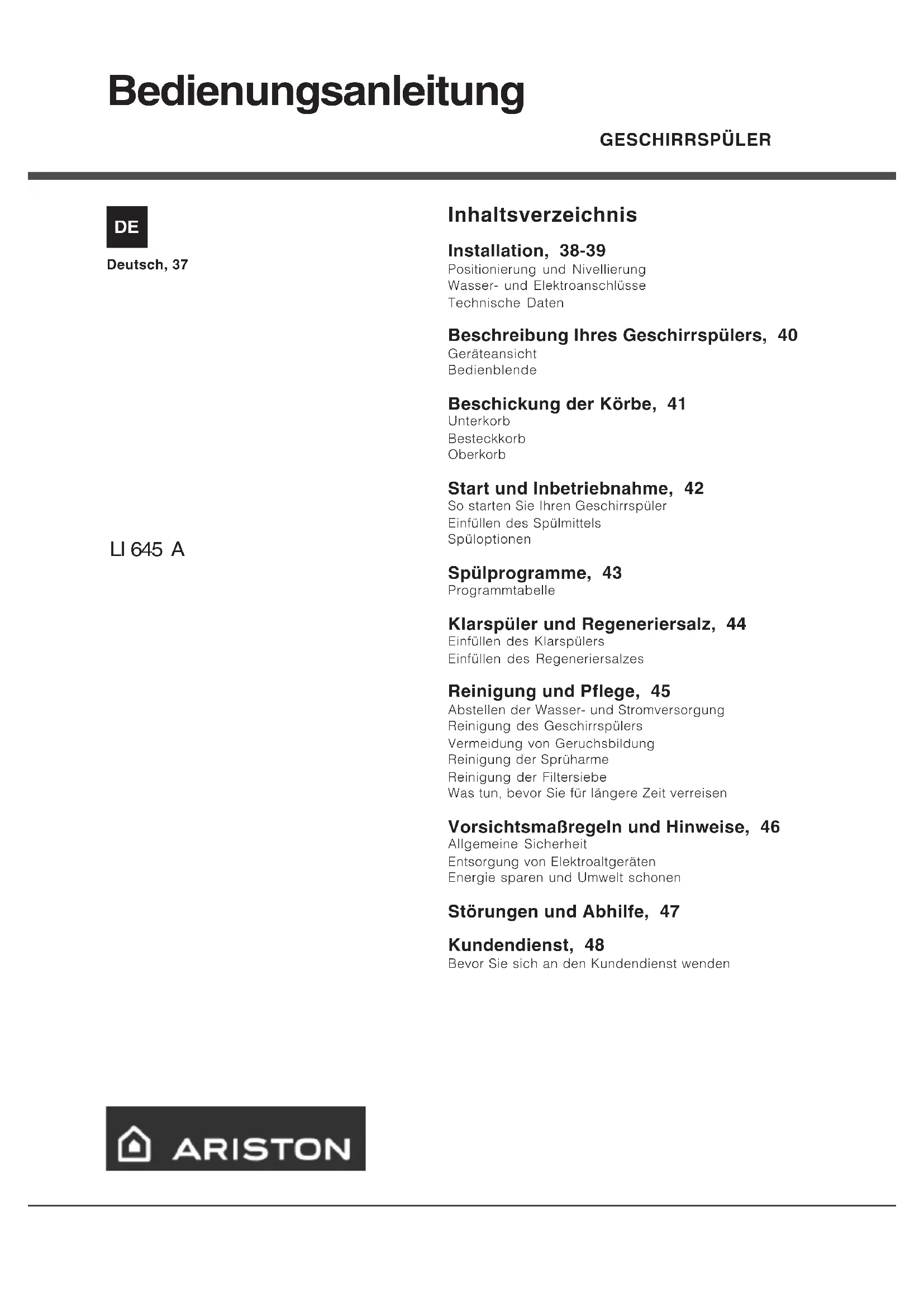 - le numéro de série (S/N) Vous trouverez ces renseignements sur l'étiquette signalétique appliquée sur le côté de la porte inox (voir Description du lave-vaisselle).GESCHIRRSPÜLER Inhaltsverzeichnis Installation, 38-39 Positionierung und Nivellierung Wasser- und Elektroanschlüsse Technische Daten Beschreibung Ihres Geschirrspülers, 40 Geräteansicht Bedienblende Beschickung der Körbe, 41 Unterkorb Besteckkorb Oberkorb Start und Inbetriebnahme, 42 So starten Sie Ihren Geschirrspüler Einfüllen des Spülmittels Spüloptionen Spülprogramme, 43 Programmtabelle Klarspüler und Regeneriersalz, 44 Einfüllen des Klarspülers Einfüllen des Regeneriersalzes Reinigung und Pflege, 45 Abstellen der Wasser- und Stromversorgung Reinigung des Geschirrspülers Vermeidung von Geruchsbildung Reinigung der Sprüharme Reinigung der Filtersiebe Was tun, bevor Sie für längere Zeit verreisen Vorsichtsmaßregeln und Hinweise, 46 Allgemeine Sicherheit Entsorgung von Elektroaltgeräten Energie sparen und Umwelt schonen Störungen und Abhilfe, 47 Kundendienst, 48 Bevor Sie sich an den Kundendienst wenden Deutsch, 37 D E Bedienungsanleitung LI 645 A38