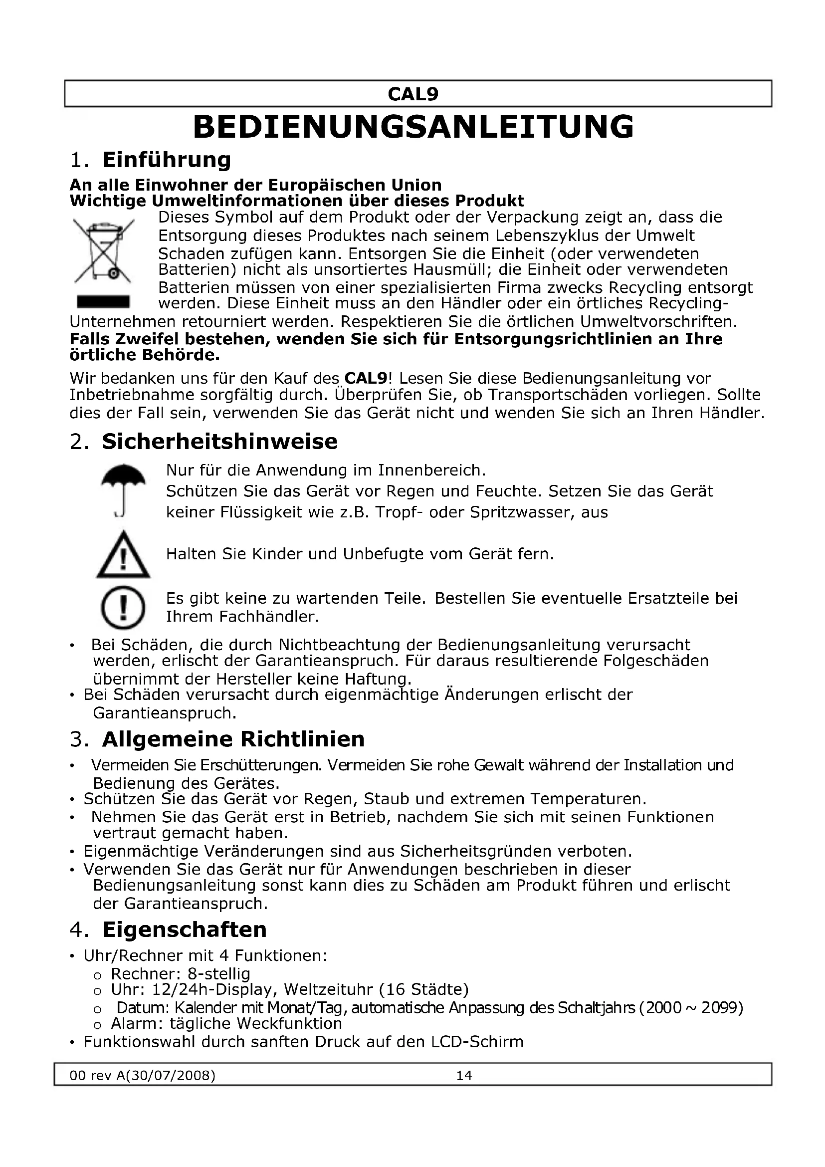 Wir bedanken uns für den Kauf des CAL9! Lesen Sie diese Bedienungsanleitung vor Inbetriebnahme sorgfältig durch. Überprüfen Sie, ob Transportschäden vorliegen. Sollte dies der Fall sein, verwenden Sie das Gerät nicht und wenden Sie sich an ihren Handler.