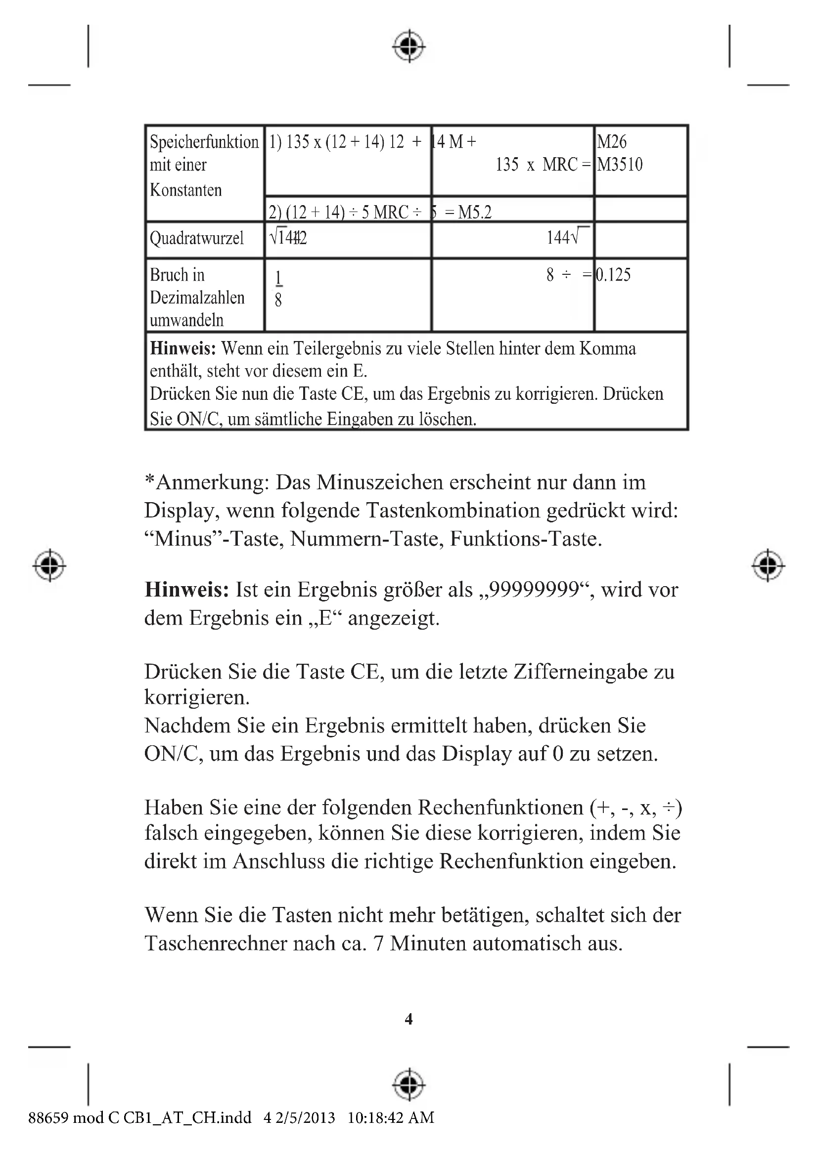 20 x 3 M – 10 M + MRC M250 M60 M10 M200 88659 mod C CB1_AT_CH.indd 3 2/5/2013 10:18:42 AM4 Hinweis: Ist ein Ergebnis größer als „99999999“, wird vor dem Ergebnis ein „E“ angezeigt. Drücken Sie die Taste CE, um die letzte Zifferneingabe zu korrigieren. Nachdem Sie ein Ergebnis ermittelt haben, drücken Sie ON/C, um das Ergebnis und das Display auf 0 zu setzen. Haben Sie eine der folgenden Rechenfunktionen (+, -, x, ÷) falsch eingegeben, können Sie diese korrigieren, indem Sie direkt im Anschluss die richtige Rechenfunktion eingeben. Wenn Sie die Tasten nicht mehr betätigen, schaltet sich der Taschenrechner nach ca. 7 Minuten automatisch aus. Speicherfunktion mit einer Konstanten