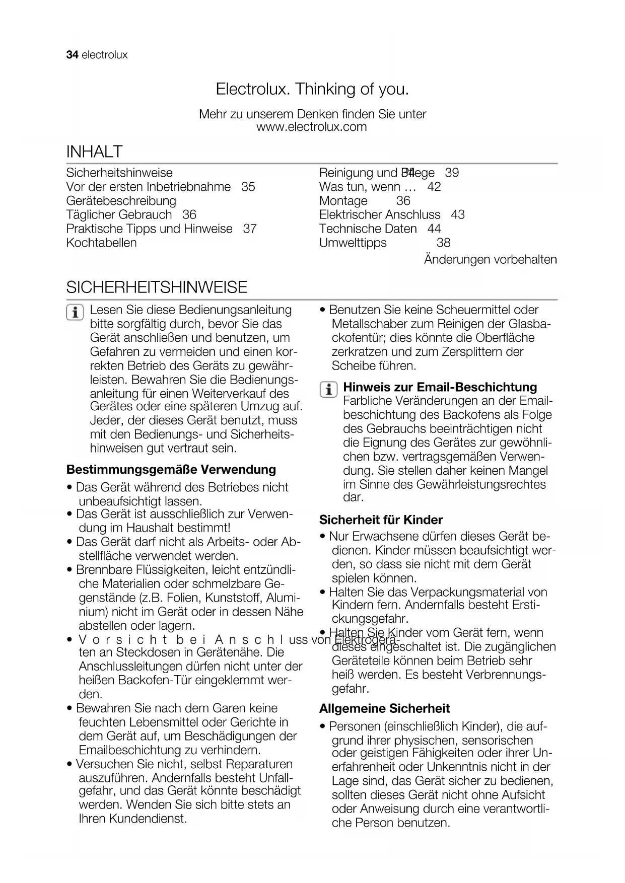 porte. Ceci pour empêcher que des en- fants ne restent enfermés à l'intérieur de l'appareil. Ils pourraient s'asphyxier ! electrolux 33Electrolux. Thinking of you. Mehr zu unserem Denken finden Sie unter www.electrolux.com INHALT Sicherheitshinweise 34 Vor der ersten Inbetriebnahme 35 Gerätebeschreibung 36 Täglicher Gebrauch 36 Praktische Tipps und Hinweise 37 Kochtabellen 38 Reinigung und Pflege 39 Was tun, wenn … 42 Montage 42 Elektrischer Anschluss 43 Technische Daten 44 Umwelttipps 44 Änderungen vorbehalten SICHERHEITSHINWEISE Lesen Sie diese Bedienungsanleitung bitte sorgfältig durch, bevor Sie das Gerät anschließen und benutzen, um Gefahren zu vermeiden und einen kor- rekten Betrieb des Geräts zu gewähr- leisten. Bewahren Sie die Bedienungs- anleitung für einen Weiterverkauf des Gerätes oder eine späteren Umzug auf. Jeder, der dieses Gerät benutzt, muss mit den Bedienungs- und Sicherheits- hinweisen gut vertraut sein. Bestimmungsgemäße Verwendung