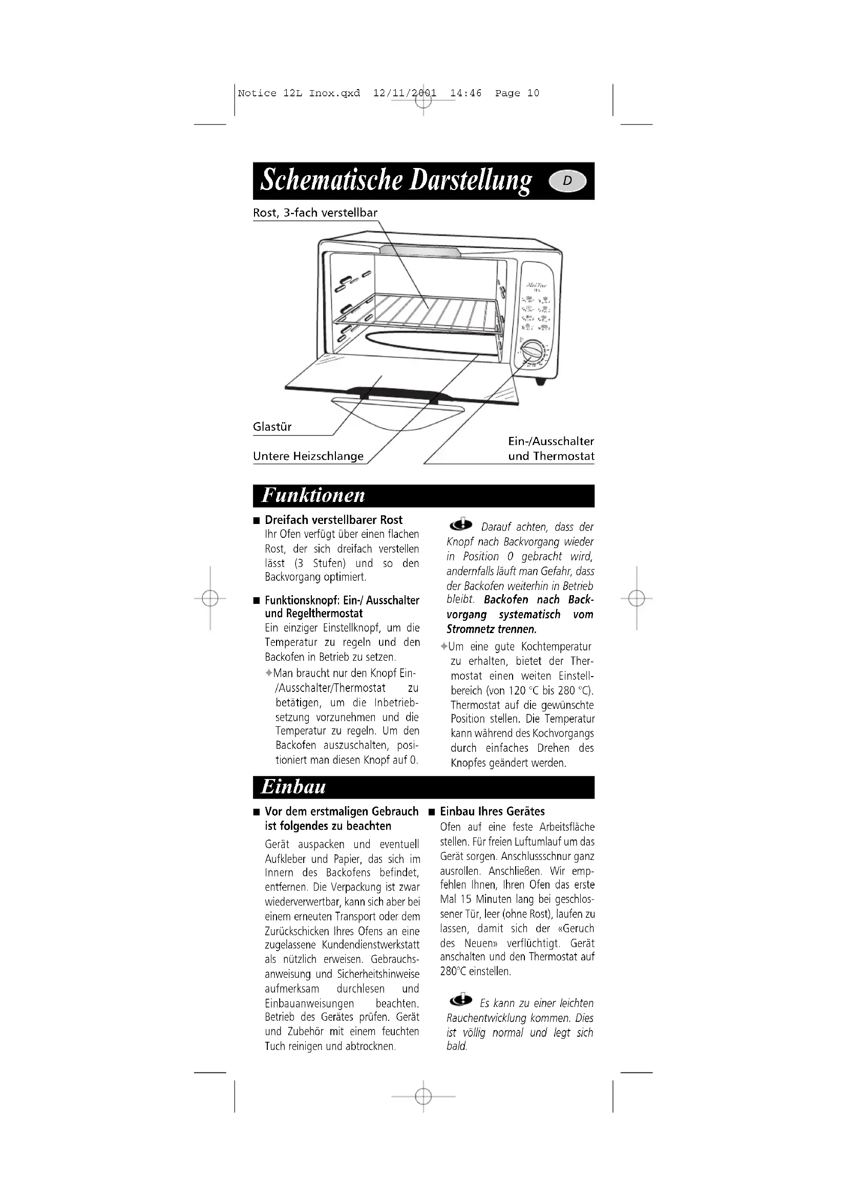 Einbau Ihres Gerätes Ofen auf eine feste Arbeitsfläche stellen. Für freien Luftumlauf um das Gerät sorgen. Anschlussschnur ganz ausrollen. Anschließen. Wir emp- fehlen Ihnen, Ihren Ofen das erste Mal 15 Minuten lang bei geschlos- sener Tür, leer (ohne Rost), laufen zu lassen, damit sich der «Geruch des Neuen» verflüchtigt. Gerät anschalten und den Thermostat auf 280°C einstellen. Es kann zu einer leichten Rauchentwicklung kommen. Dies ist völlig normal und legt sich bald. Untere Heizschlange Ein-/Ausschalter und Thermostat Glastür Rost, 3-fach verstellbar