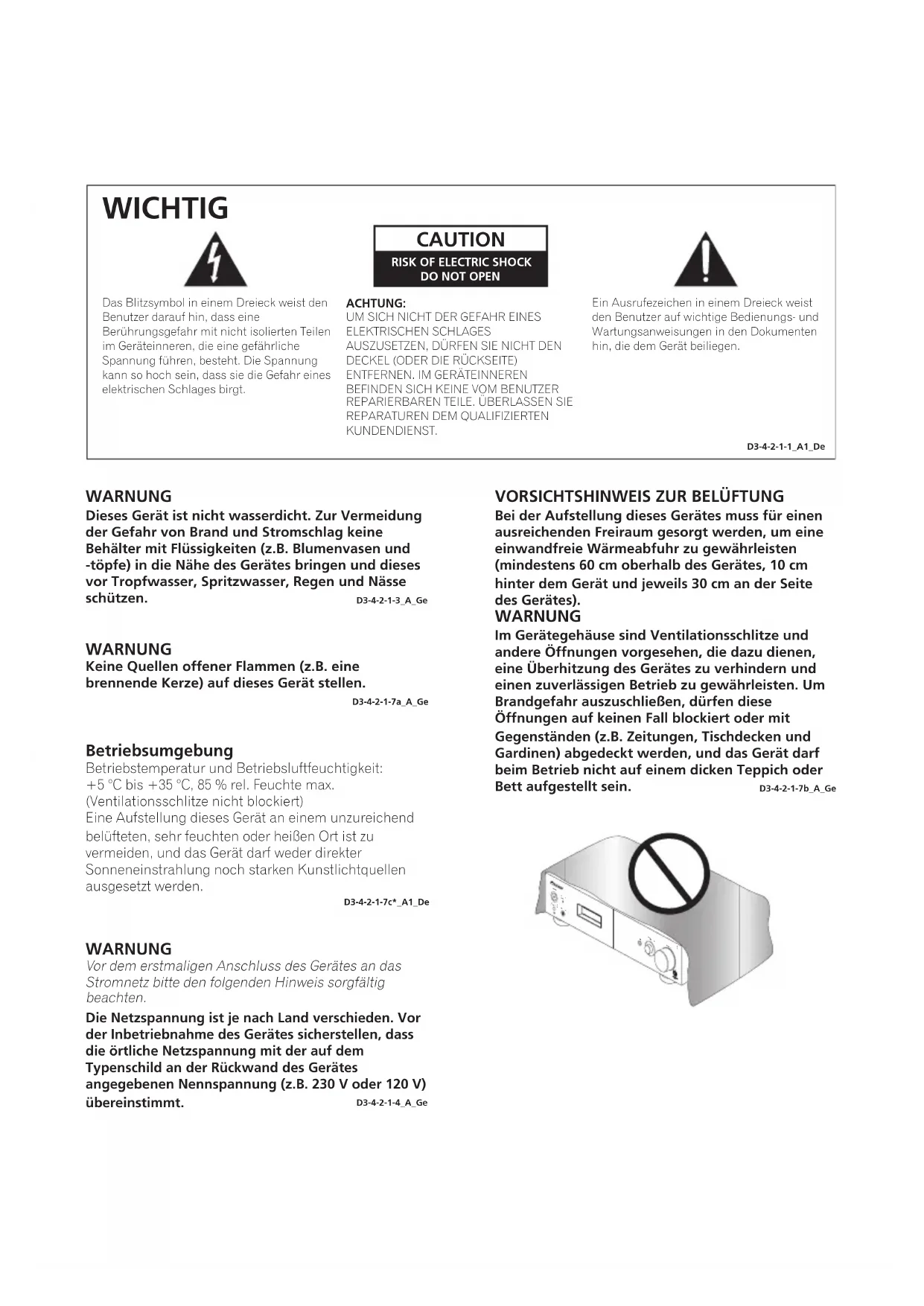 WICHTIG D3-4-2-1-1_A1_De WARNUNG Dieses Gerät ist nicht wasserdicht. Zur Vermeidung der Gefahr von Brand und Stromschlag keine Behälter mit Flüssigkeiten (z.B. Blumenvasen und -töpfe) in die Nähe des Gerätes bringen und dieses vor Tropfwasser, Spritzwasser, Regen und Nässe schützen. D3-4-2-1-3_A_Ge WARNUNG Keine Quellen offener Flammen (z.B. eine brennende Kerze) auf dieses Gerät stellen. D3-4-2-1-7a_A_Ge Betriebsumgebung Betriebstemperatur und Betriebsluftfeuchtigkeit: +5 °C bis +35 °C, 85 % rel. Feuchte max. (Ventilationsschlitze nicht blockiert) Eine Aufstellung dieses Gerät an einem unzureichend belüfteten, sehr feuchten oder heißen Ort ist zu vermeiden, und das Gerät darf weder direkter Sonneneinstrahlung noch starken Kunstlichtquellen ausgesetzt werden. D3-4-2-1-7c*_A1_De WARNUNG Die Netzspannung ist je nach Land verschieden. Vor der Inbetriebnahme des Gerätes sicherstellen, dass die örtliche Netzspannung mit der auf dem Typenschild an der Rückwand des Gerätes angegebenen Nennspannung (z.B. 230 V oder 120 V) übereinstimmt. D3-4-2-1-4_A_Ge Vor dem erstmaligen Anschluss des Gerätes an das Stromnetz bitte den folgenden Hinweis sorgfältig beachten.