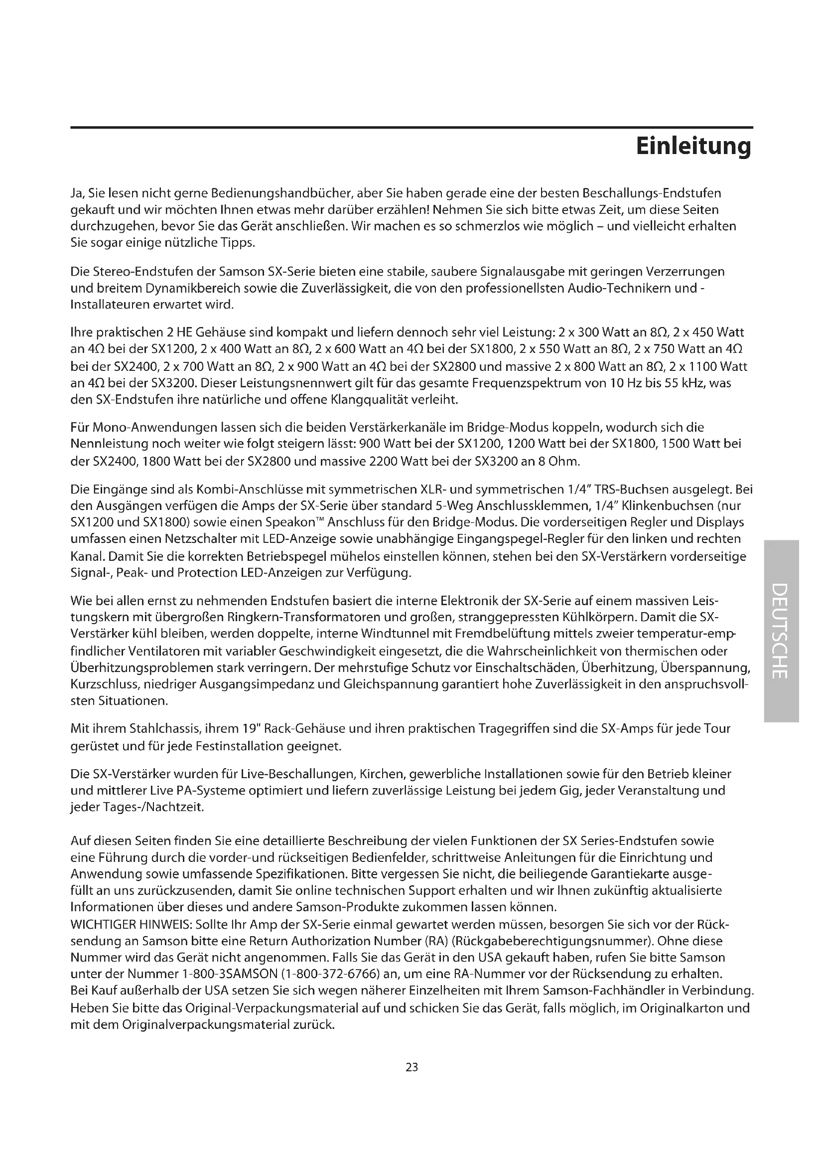 Auf diesen Seiten finden Sie eine detaillierte Beschreibung der vielen Funktionen der SX Series-Endstufen sowie eine Führung durch die vorder-und rückseitigen Bedienfelder, schrittweise Anleitungen fur die Einrichtung und Anwendung sowie umfassende Spezifikationen.itte vergessen Sie nicht, die beiliegende Garantiekarte ausgefüllt an uns zurückzusenden, damit Sie online technischen Support erhalten und wir Ihnen zukünftig aktualisierte Informationen über这点es und andere Samson-Produkte sukommen halten können.
