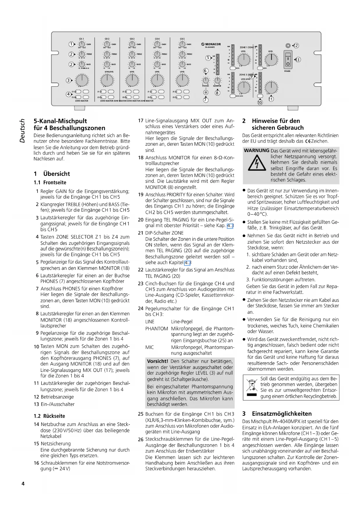 Wird das Gerät zweckentfremdet, nicht rich- tig angeschlossen, falsch bedient oder nicht fachgerecht repariert, kann keine Garantie für das Gerät und keine Haftung für daraus resultierende Sach- oder Personenschäden übernommen werden. Soll das Gerät endgültig aus dem Be- trieb genommen werden, übergeben Sie es zur umweltgerechten Entsor- gung einem örtlichen Recyclingbetrieb. 3 Einsatzmöglichkeiten Das Mischpult PA-4040MPX ist speziell für den Einsatz in ELA-Anlagen konzipiert. An die fünf Eingänge können Mikrofone (CH 1 – 3) oder Ge- räte mit einem Line-Pegel-Ausgang (CH 1 – 5) angeschlossen werden. Alle Eingänge lassen sich unabhängig voneinander auf vier Beschal- lungszonen schalten. Zur Kontrolle der Zonen- ausgangssignale sind ein Kopfhörer- und ein Lautsprecherausgang vorhanden. Deutsch Deutsch Seite Inhalt5 Deutsch CH 5 TEL. ZONE VOLUME LINE CH 4 LINE