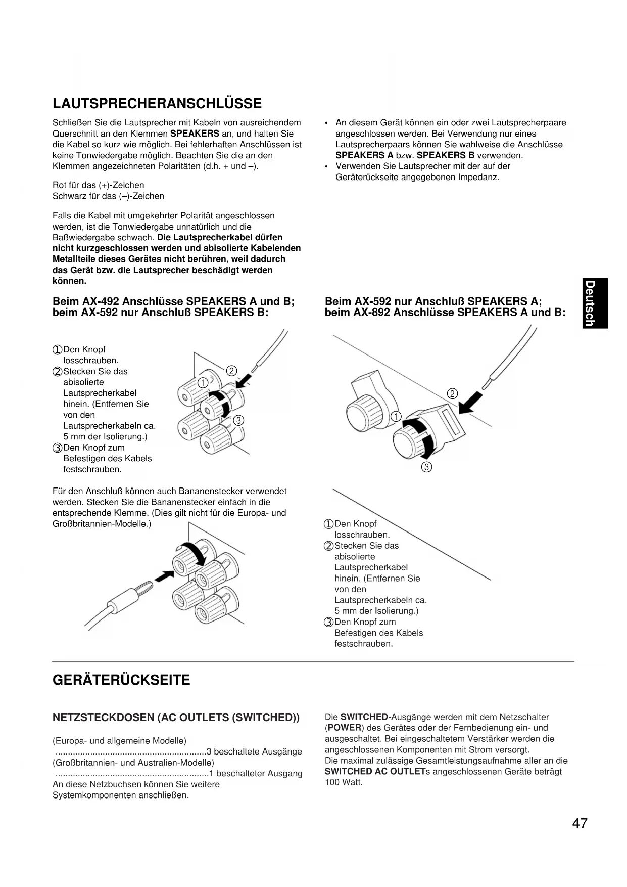 Verwenden Sie Lautsprecher mit der auf der Geräterückseite angegebenen Impedanz. Beim AX-592 nur Anschluß SPEAKERS A; beim AX-892 Anschlüsse SPEAKERS A und B: LAUTSPRECHERANSCHLÜSSE