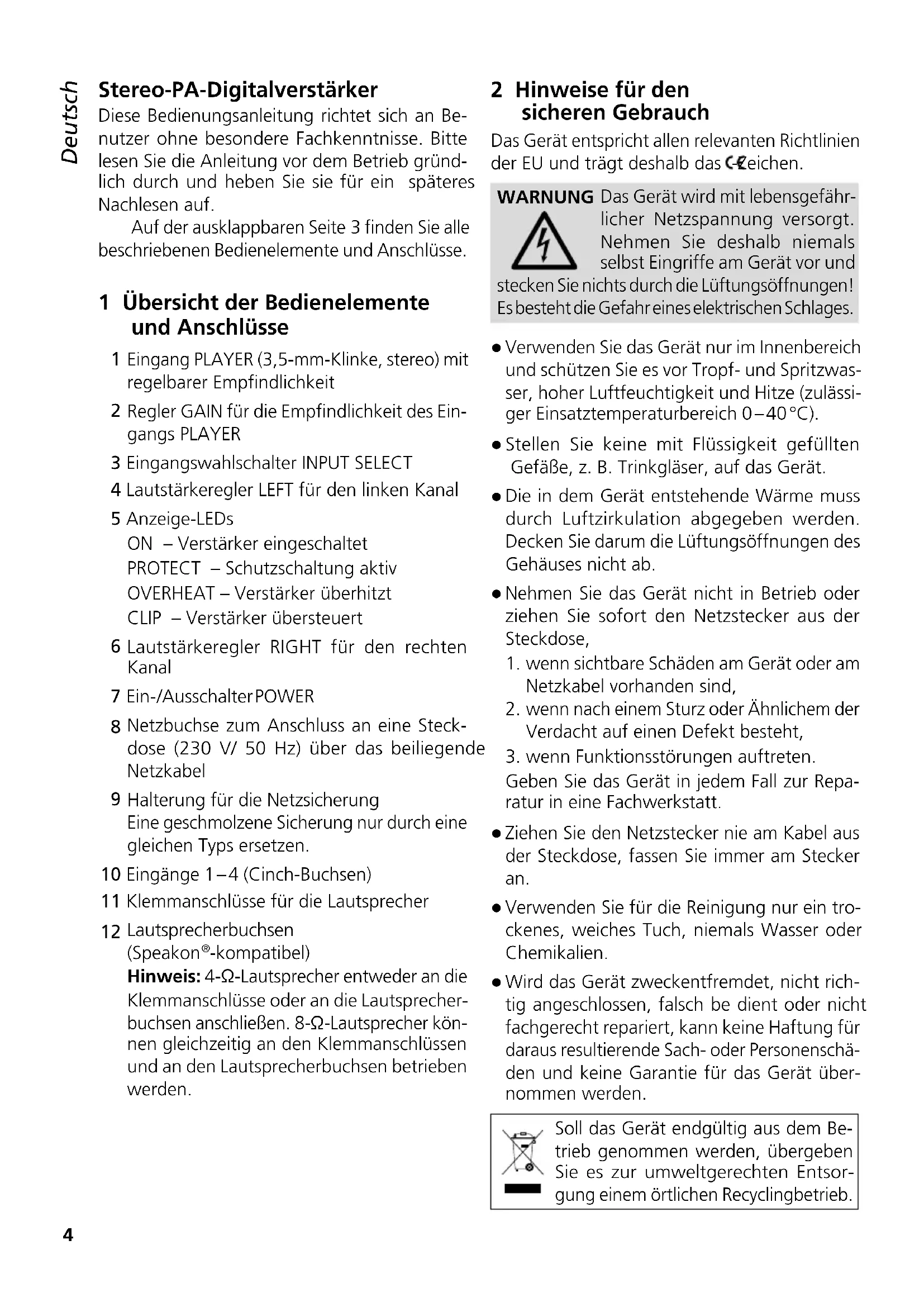 4 Ω 37,5 W 8 Ω 62,5 W 8 Ω 62,5 W 4 Ω 31 W 4 Ω 31 W 4 Ω 31 W 8 Ω 19 W 8 Ω 19 W 8 Ω 19 W 8 Ω 19 W 4 Ω 37,5 W4 Deutsch English English Page Français Français Page Italiano Italiano Pagina Español Español Página Nederlands Nederlands Pagina Polski Polski Strona Deutsch Deutsch Seite Stereo-PA-Digitalverstärker Diese Bedienungsanleitung richtet sich an Be- nutzer ohne besondere Fachkenntnisse. Bitte lesen Sie die Anleitung vor dem Betrieb gründ- lich durch und heben Sie sie für ein späteres Nachlesen auf. Auf der ausklappbaren Seite3 finden Sie alle beschriebenen Bedienelemente und Anschlüsse. 1 Übersicht der Bedienelemente und Anschlüsse