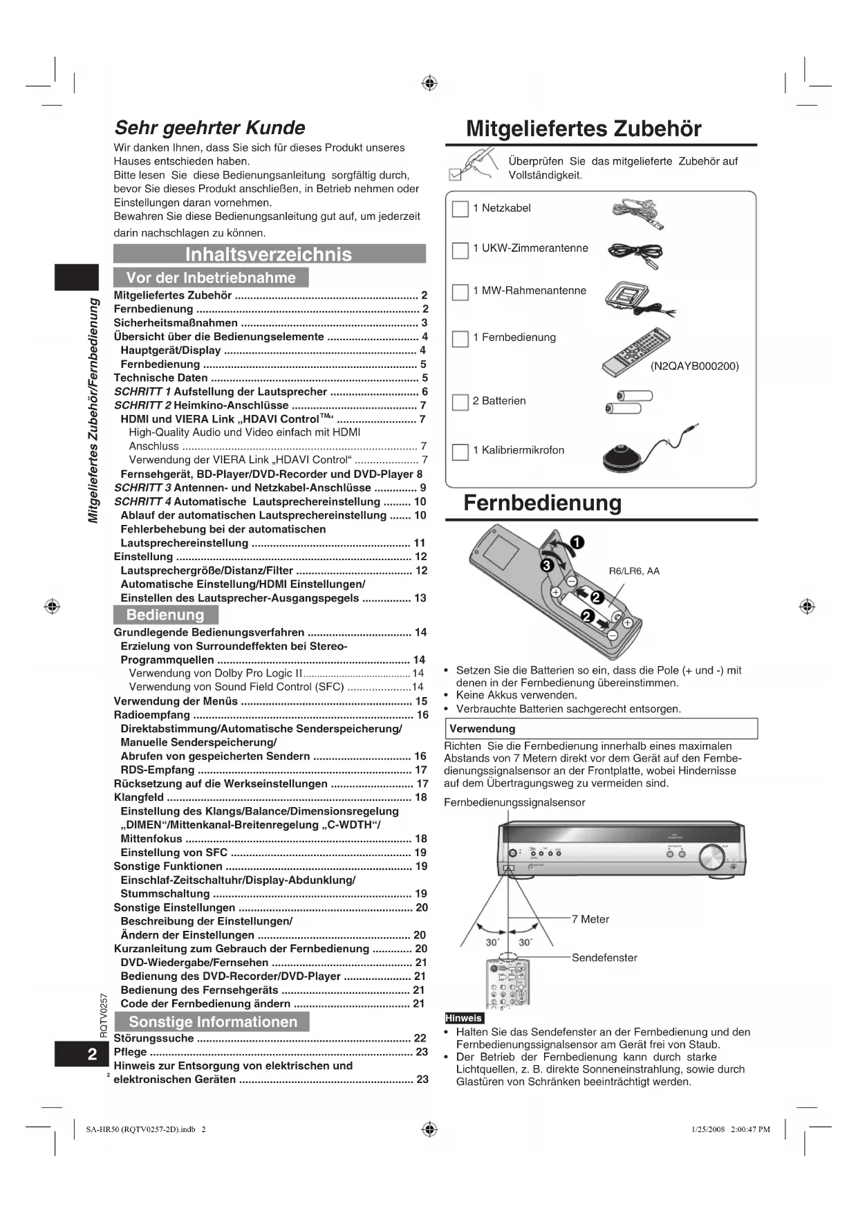 - Automatische Einstellung/HDMI Einstellungen/Einstellen des Lautsprecher-Ausgangspegels Inhaltsverzeichnis Vor der Inbetriebnahme Sehr geehrter Kunde Wir danken Ihnen, dass Sie sich für dieses Produkt unseres Hauses entschieden haben.Bitte lesen Sie diese Bedienungsanleitung sorgfältig durch, bevor Sie dieses Produkt anschließen, in Betrieb nehmen oder Einstellungen daran vornehmen. Bewahren Sie diese Bedienungsanleitung gut auf, um jederzeit darin nachschlagen zu können. Mitgeliefertes Zubehör (N2QAYB000200) Überprüfen Sie das mitgelieferte Zubehör auf Vollständigkeit.1 Netzkabel1 UKW-Zimmerantenne1 MW-Rahmenantenne1 Fernbedienung2 Batterien p. 13