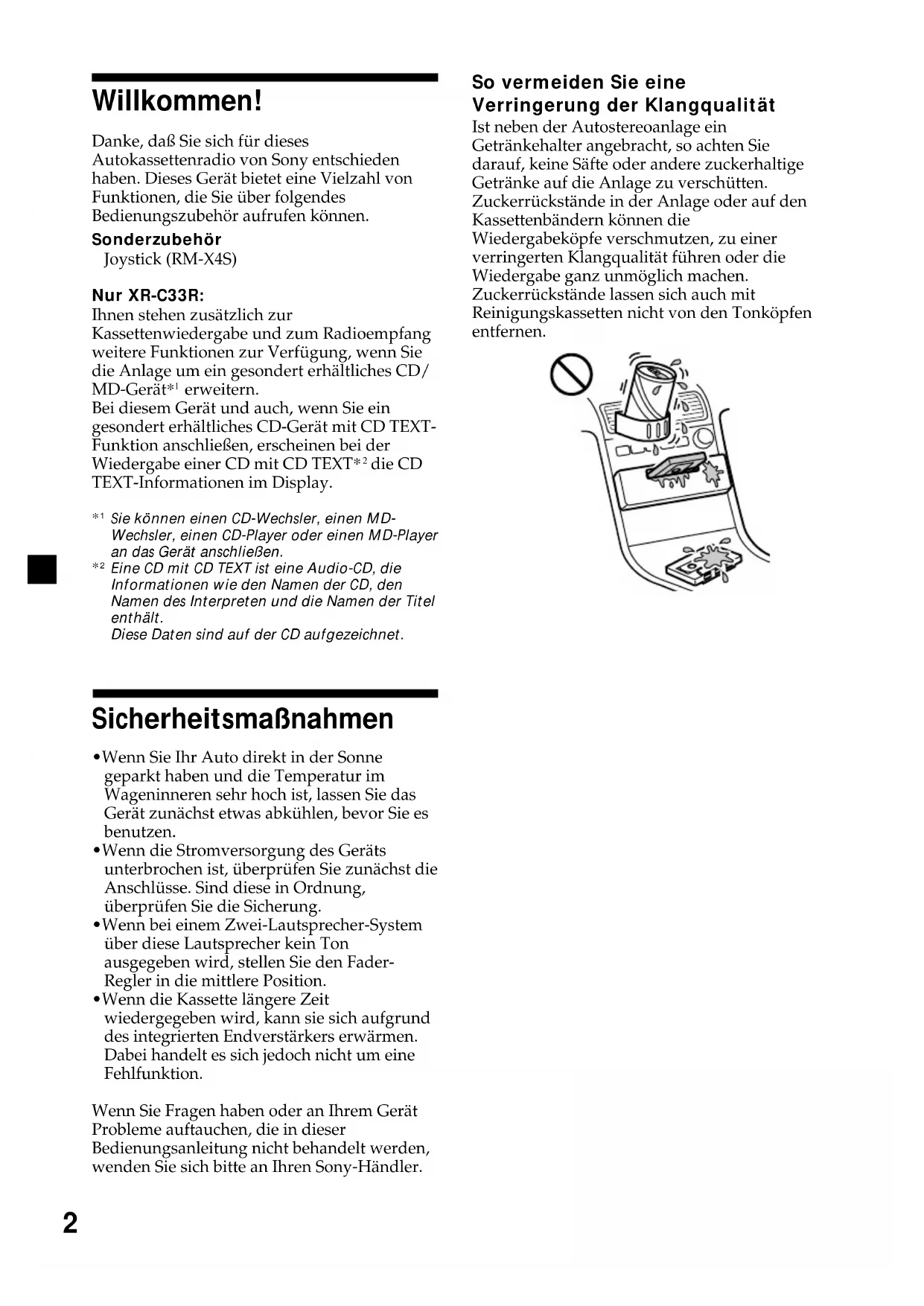 - Wenn die Kassette längere Zeit wiedergegeben wird, kann sie sich aufgrund des integrierten Endverstärkers erwärmen. Dabei handelt es sich jedoch nicht um eine Fehlfunktion. Wenn Sie Fragen haben oder an Ihrem Gerät Probleme auftauchen, die in dieser Bedienungsanleitung nicht behandelt werden, wenden Sie sich bitte an Ihren Sony-Händler. Willkommen! So vermeiden Sie eine Verringerung der Klangqualität Ist neben der Autostereoanlage ein Getränkehalter angebracht, so achten Sie darauf, keine Säfte oder andere zuckerhaltige Getränke auf die Anlage zu verschütten. Zuckerrückstände in der Anlage oder auf den Kassettenbändern können die Wiedergabeköpfe verschmutzen, zu einer verringerten Klangqualität führen oder die Wiedergabe ganz unmöglich machen. Zuckerrückstände lassen sich auch mit Reinigungskassetten nicht von den Tonköpfen entfernen.3 Umgang mit Kassetten Pflege von Kassetten