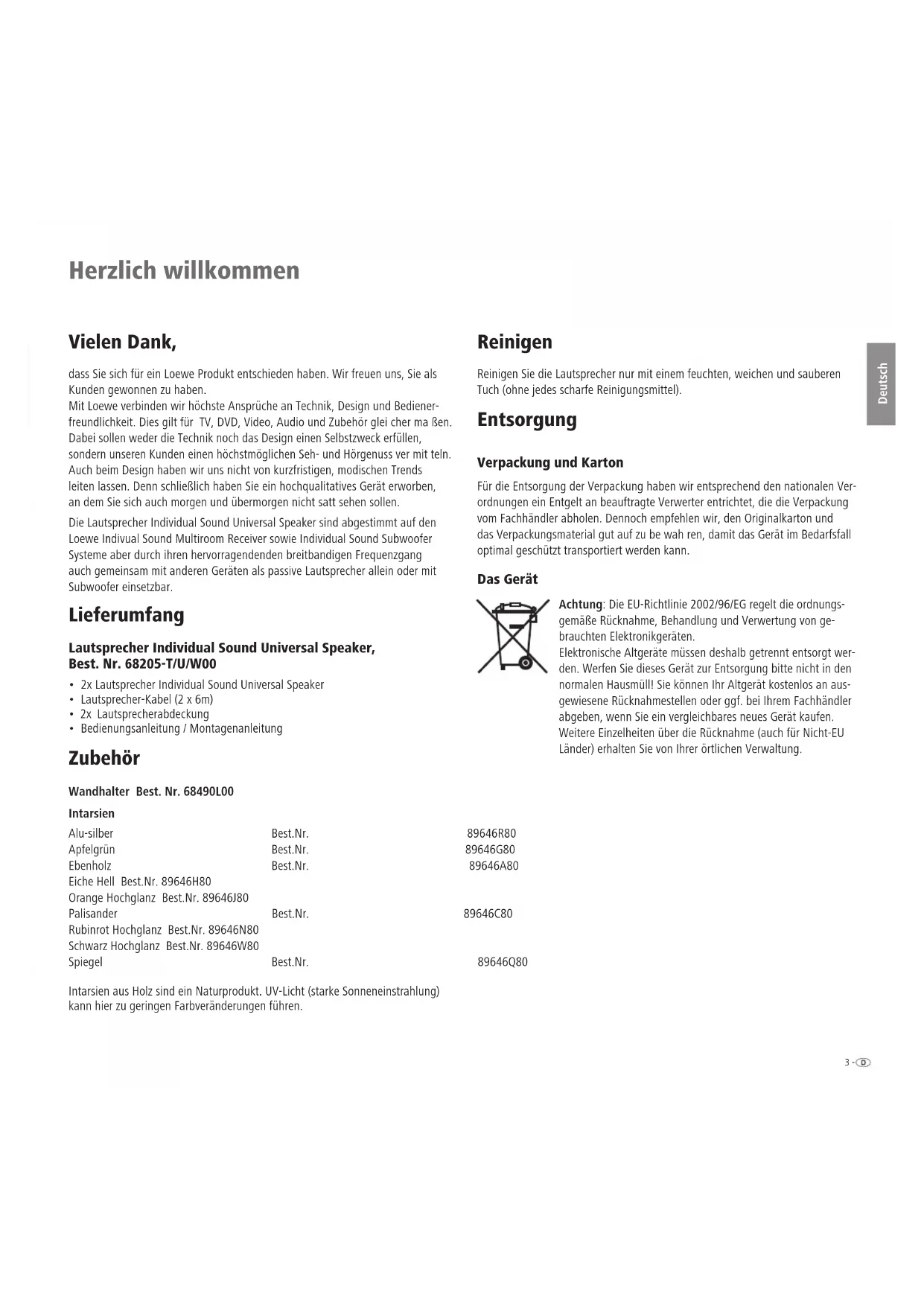 - Bedienungsanleitung / Montagenanleitung Zubehör Wandhalter Best. Nr. 68490L00 Intarsien Alu-silber Best.Nr. 89646R80 Apfelgrün Best.Nr. 89646G80 Ebenholz Best.Nr. 89646A80 Eiche Hell Best.Nr. 89646H80 Orange Hochglanz Best.Nr. 89646J80 Palisander Best.Nr. 89646C80 Rubinrot Hochglanz Best.Nr. 89646N80 Schwarz Hochglanz Best.Nr. 89646W80 Spiegel Best.Nr. 89646Q80 Intarsien aus Holz sind ein Naturprodukt. UV-Licht (starke Sonneneinstrahlung) kann hier zu geringen Farbveränderungen führen. Reinigen Reinigen Sie die Lautsprecher nur mit einem feuchten, weichen und sauberen Tuch (ohne jedes scharfe Reinigungsmittel). Entsorgung Verpackung und Karton Für die Entsorgung der Verpackung haben wir entsprechend den nationalen Ver- ordnungen ein Entgelt an beauftragte Verwerter entrichtet, die die Verpackung vom Fachhändler abholen. Dennoch empfehlen wir, den Originalkarton und das Verpackungsmaterial gut auf zu be wah ren, damit das Gerät im Bedarfsfall optimal geschützt transportiert werden kann. Das Gerät Achtung: Die EU-Richtlinie 2002/96/EG regelt die ordnungs- gemäße Rücknahme, Behandlung und Verwertung von ge- brauchten Elektronikgeräten. Elektronische Altgeräte müssen deshalb getrennt entsorgt wer- den. Werfen Sie dieses Gerät zur Entsorgung bitte nicht in den normalen Hausmüll! Sie können Ihr Altgerät kostenlos an aus- gewiesene Rücknahmestellen oder ggf. bei Ihrem Fachhändler abgeben, wenn Sie ein vergleichbares neues Gerät kaufen. Weitere Einzelheiten über die Rücknahme (auch für Nicht-EU Länder) erhalten Sie von Ihrer örtlichen Verwaltung.- 4 Deutsch Zu Ihrer Sicherheit Zu Ihrer eigenen Sicherheit und um unnötigen Schaden von Ihrem Gerät abzu- wenden, lesen und beachten Sie die nachfolgenden Sicherheitshinweise: