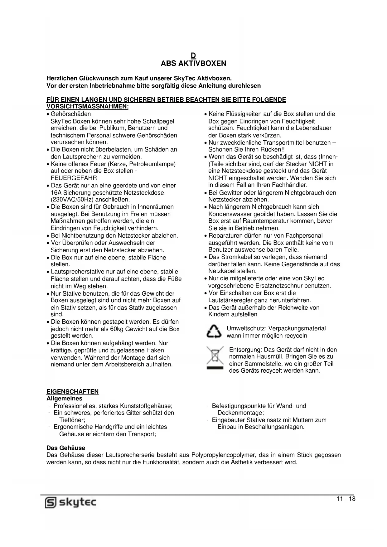 Herzlichen Glückwunsch zum Kauf unserer SkyTec Aktivboxen. Vor der ersten Inbetriebnahmeitte sorgfaltigthese Anleitung durchlesen
