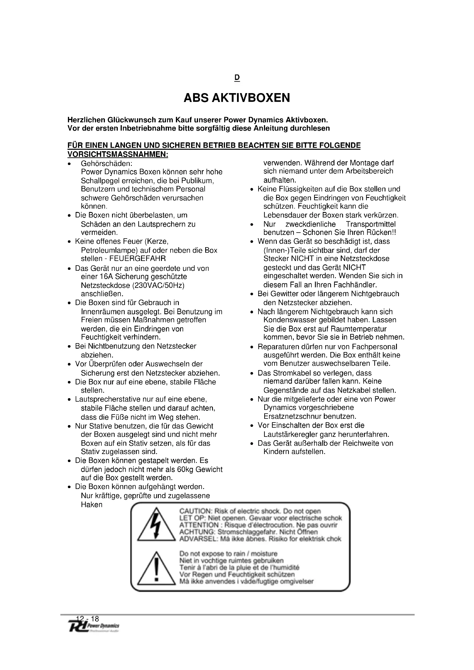 Gehorschaden: Power Dynamics Boxen konnen sehr hohe Schallpegel erreichen, die bei Publikum, Benutzern und technischem Personal schwere Gehorschaden verursachen konnen.
