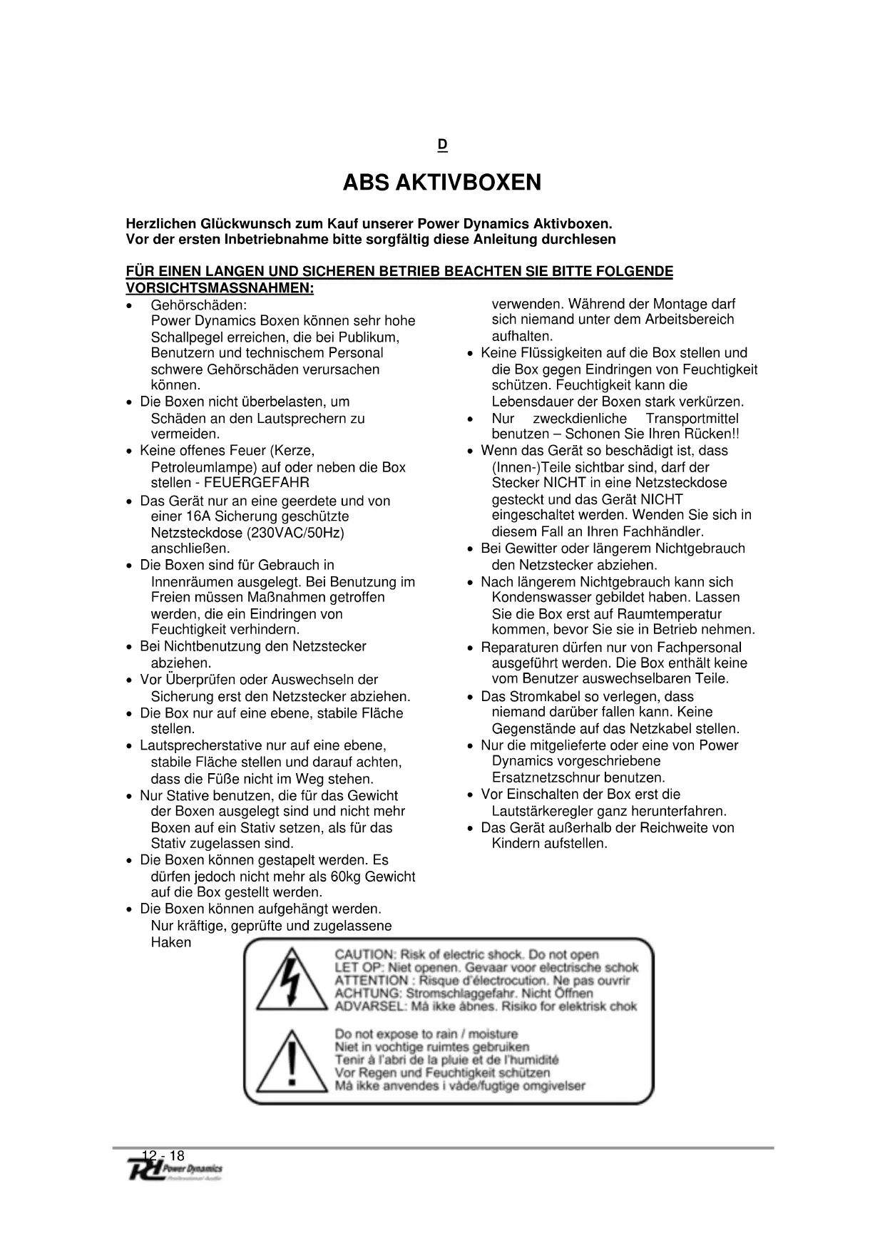 Herzlichen Glückwunsch zum Kauf unserer Power Dynamics Aktivboxen. Vor der ersten Inbetriebnahme bitte sorgfältig diese Anleitung durchlesen