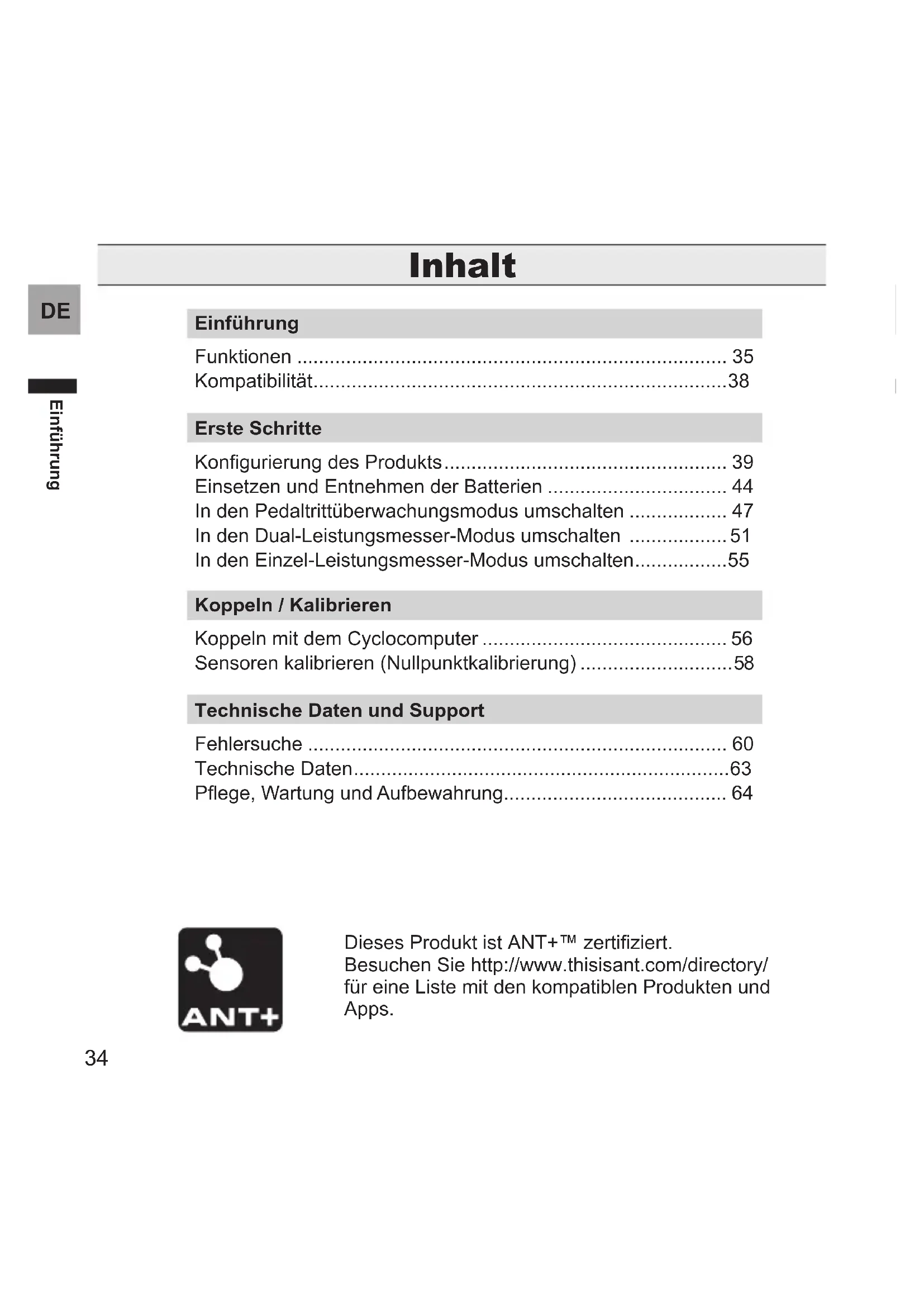 - Pege, Wartung und Aufbewahrung Einführung Dieses Produkt ist ANT+™ zertiziert. Besuchen Sie http://www.thisisant.com/directory/ für eine Liste mit den kompatiblen Produkten und Apps.35 p. 64