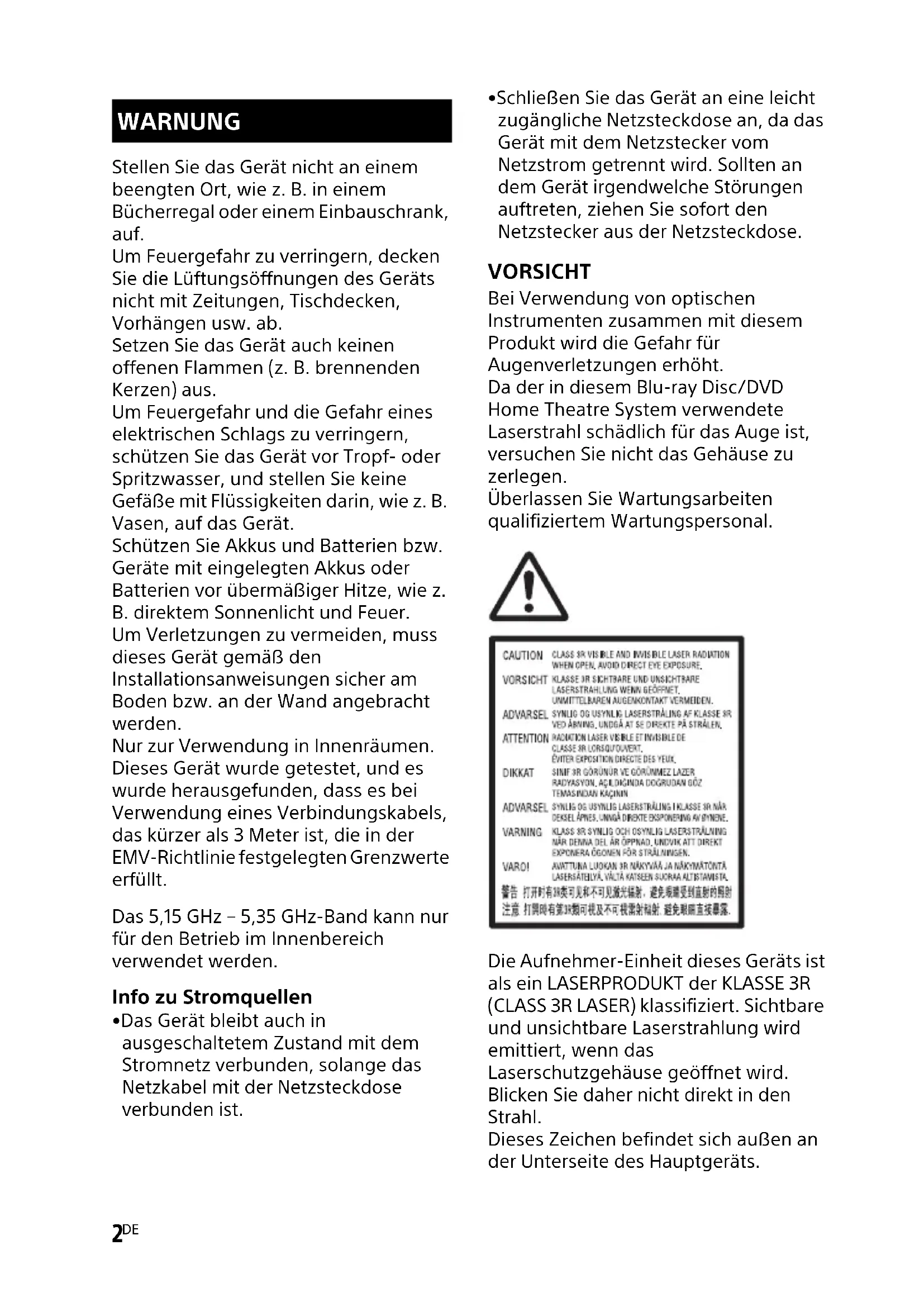 - Schließen Sie das Gerät an eine leicht zugängliche Netzsteckdose an, da das Gerät mit dem Netzstecker vom Netzstrom getrennt wird. Sollten an dem Gerät irgendwelche Störungen auftreten, ziehen Sie sofort den Netzstecker aus der Netzsteckdose. VORSICHT Bei Verwendung von optischen Instrumenten zusammen mit diesem Produkt wird die Gefahr für Augenverletzungen erhöht. Da der in diesem Blu-ray Disc/DVD Home Theatre System verwendete Laserstrahl schädlich für das Auge ist, versuchen Sie nicht das Gehäuse zu zerlegen. Überlassen Sie Wartungsarbeiten qualifiziertem Wartungspersonal. Die Aufnehmer-Einheit dieses Geräts ist als ein LASERPRODUKT der KLASSE 3R (CLASS 3R LASER) klassifiziert. Sichtbare und unsichtbare Laserstrahlung wird emittiert, wenn das Laserschutzgehäuse geöffnet wird. Blicken Sie daher nicht direkt in den Strahl. Dieses Zeichen befindet sich außen an der Unterseite des Hauptgeräts. WARNUNGD:\NORM'S JOB\SONY HA\SO160050\BDV-N9200_7200_5200_Ref (PMRF 05)\4485833161_GBFRESDENLITPL (CEK)\DE\020REG.fm masterpage: Right
